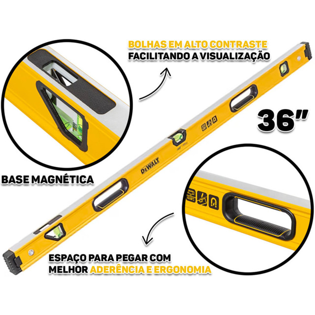 Nível De Alumínio Profissional 36 Polegadas Com Base Magnética Três Bolhas 90cm Dewalt