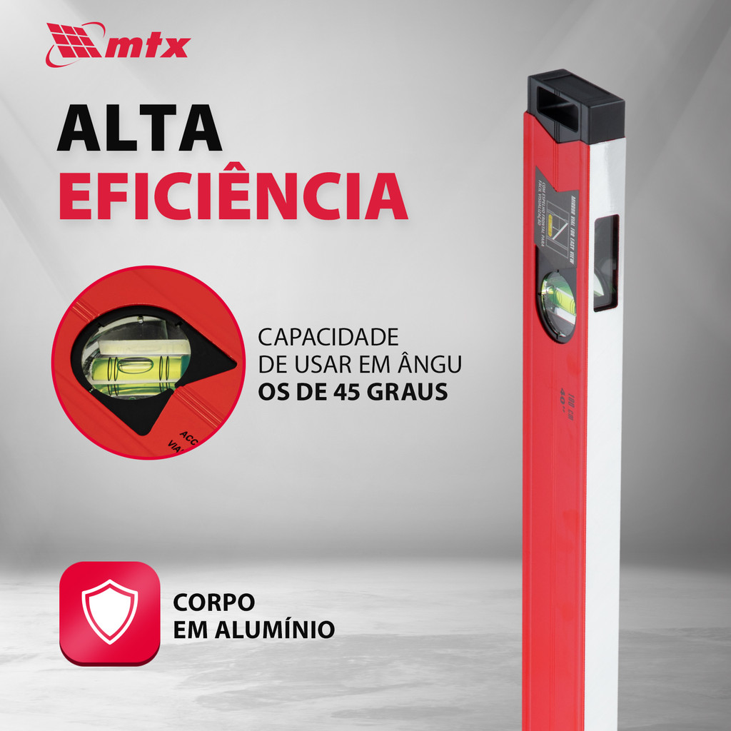 O Nível Magnético de Alumínio MTX 347109, com um impressionante comprimento de 1000 mm, é uma ferramenta essencial para profissionais que buscam precisão e eficiência em seus trabalhos. Este nível reforçado está meticulosamente projetado para oferecer leituras exatas, facilitando a detecção de desvios da vertical, horizontal e ângulos de 45 graus, tornando-se indispensável em uma ampla gama de projetos de construção e instalação. Características Distintivas: Três Bolhas para Medição Multidimensional: Equipado com três bolhas de ar, o Nível MTX 347109 permite uma detecção precisa de desvios em múltiplas direções. Esta funcionalidade é crucial para assegurar que todos os elementos de um projeto estejam perfeitamente alinhados e nivelados, garantindo resultados de alta qualidade. Refletor Espelhado para Leituras Claras: O visor espelhado embutido é uma característica inovadora que eleva a conveniência do trabalho, permitindo que as medições sejam lidas facilmente sem a necessidade de ajustar a posição ou a postura, melhorando a eficiência e reduzindo o tempo gasto em cada tarefa. Vantagens Incomparáveis: Construído para Uso Intensivo: O perfil de alumínio do nível, reforçado com nervuras de rigidez, é projetado pensando na durabilidade e na resistência ao uso contínuo. Esta construção robusta assegura que o nível possa suportar as exigências de ambientes de trabalho rigorosos, mantendo sua precisão ao longo do tempo. Estabilidade Aprimorada Contra Torção: As nervuras de rigidez não apenas conferem ao nível uma maior resistência estrutural, mas também aumentam significativamente sua estabilidade, prevenindo torções que poderiam comprometer a precisão das medições. Facilidade de Fixação com Faixa Magnética: A faixa magnética integrada é uma característica valiosa, especialmente para trabalhos de encanamento, pois permite que o nível seja facilmente fixado em superfícies metálicas. Isso libera as mãos do usuário para outras tarefas, aumentando a praticidade e a eficiência do trabalho. Proteção Contra Impactos e Detritos: As tampas de extremidade oferecem uma camada adicional de proteção contra impactos mecânicos e detritos, prolongando a vida útil da ferramenta. Além disso, os orifícios presentes nas tampas facilitam o armazenamento suspenso, otimizando o espaço de trabalho e mantendo o nível acessível. Uso Eficiente para Medição de Desvios Verticais: Para medições precisas de desvio vertical em 90°, a bolha de ar deve ser utilizada exclusivamente na posição superior do nível. A superfície de base, localizada opostamente à bolha de ar em 180°, serve como a superfície de trabalho, garantindo medições confiáveis e precisas. O Nível Magnético de Alumínio MTX 347109 é mais do que uma ferramenta; ele é um aliado indispensável para garantir a precisão e a eficiência dos seus projetos. Combinando funcionalidades avançadas, construção durável e inovações práticas, este nível estabelece um novo padrão de excelência para profissionais em diversas áreas, assegurando resultados consistentemente precisos e de alta qualidade.