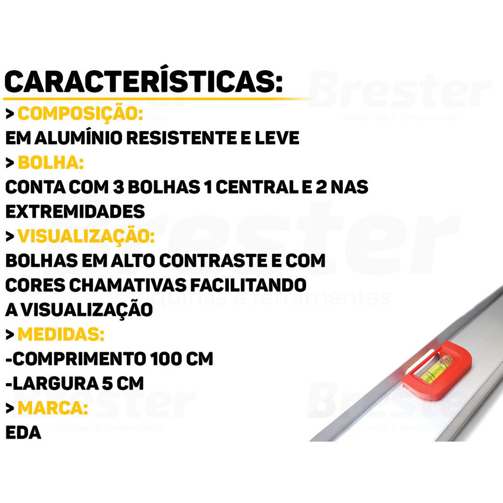 Nível De Alumínio Profissional 100cm Eda O Nível de Alumínio Profissional 100cm Eda é uma ferramenta essencial para quem busca precisão em seus projetos. Fabricado com alumínio de alta qualidade, este nível oferece resistência e leveza, facilitando o manuseio e garantindo longa vida útil. Com 100 cm de comprimento, é ideal para nivelamento em superfícies grandes, como pisos, paredes e estruturas de construção. Características: > Estrutura robusta e resistente; > Design ergonômico proporcionam conforto e segurança no uso diário; > Possui três bolhas, sendo elas uma diagonal, uma vertical e uma horizontal; > Possui leitura precisa e fácil, garantindo resultados confiáveis em todas as suas tarefas. Especificações Técnicas: > Dimensões do produto: - Comprimento: 100cm; - Espessura: 24mm; - Largura: 53mm; > Material: corpo em alumínio e bolhas em plástico. - Marca: Eda - Garantia: 90 dias contra defeitos de fabricação Vantagens de comprar na Brester: - Produto a pronta entrega. - Produto novo, com garantia de fábrica. - Nota fiscal para Pessoa Física e Pessoa Jurídica.