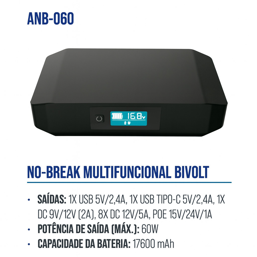 NO-BREAK MULTIFUNCIONAL BIVOLT - Saídas USB, Tipo-C, DC e PoE, Potência 60W, Bateria 17600mAh