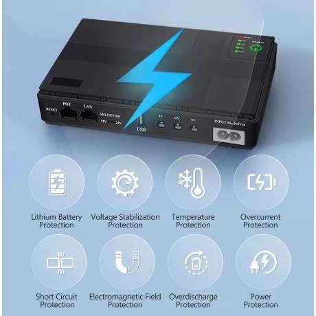 No-Break Multifuncional Portátil 36W USB Proteção Sobrecarga Garanta a segurança e o funcionamento ininterrupto dos seus dispositivos eletrônicos com o Nobreak. Ideal para residências, escritórios e ambientes profissionais, este nobreak oferece proteção contra quedas de energia, surtos e picos, assegurando que seus equipamentos funcionem corretamente e evitando perdas de dados e danos hardware. Ele protege contra surtos, picos, variações de tensão, sobrecargas e curtos-circuitos, prolongando a vida útil dos seus equipamentos eletrônicos. Além de facilita o monitoramento do status da bateria, da carga e das condições de operação através de indicadores LED claros e intuitivos, ele também ocupa pouco espaço e possui um design que se adapta facilmente a qualquer ambiente. Dimensões: 16x10x3cm (CxLxA) Peso: 0,400g Principais Recursos: - Tipo de bateria: Lítio integrada - Garantia de confiabilidade: Controlador de microprocessador - Funcionalidade: Inicialização automática - Recurso de segurança: Proteção contra sobrecarga de curto-circuito - Interruptor de desligamento: Manual - Recurso de indicação: LEDs indicadores de funcionamento - Seletor de tensão: 15V/24V DC - Recurso adicional: Carregador USB de 5V DC - Utilização recomendada: Roteador, modem, smartphone, sistema de vigilância por vídeo Especificações: - Entrada: 80-265V/50/60Hz - Saidas: USB 5V/2A, DC 5V/2A, DC 9V/2A, DC 12V/2A, POE 15V/1A, POE 24V/1A - Potência de saída (máx): 36W - Capacidade de bateria: 4x 2600mAh - Temperatura operacional: 0 a 45°c - Umidade operacional: 10 a 90% RH - Composição: Plástico e componentes eletrônicos. Itens inclusos: 1x No-Break Portátil 1x Cabo de energia AC 1x Cabo de energia DC macho para macho (1 para 1) 1x Cabo de energia DC macho para macho (1 para 2) 1x Manual do usuário