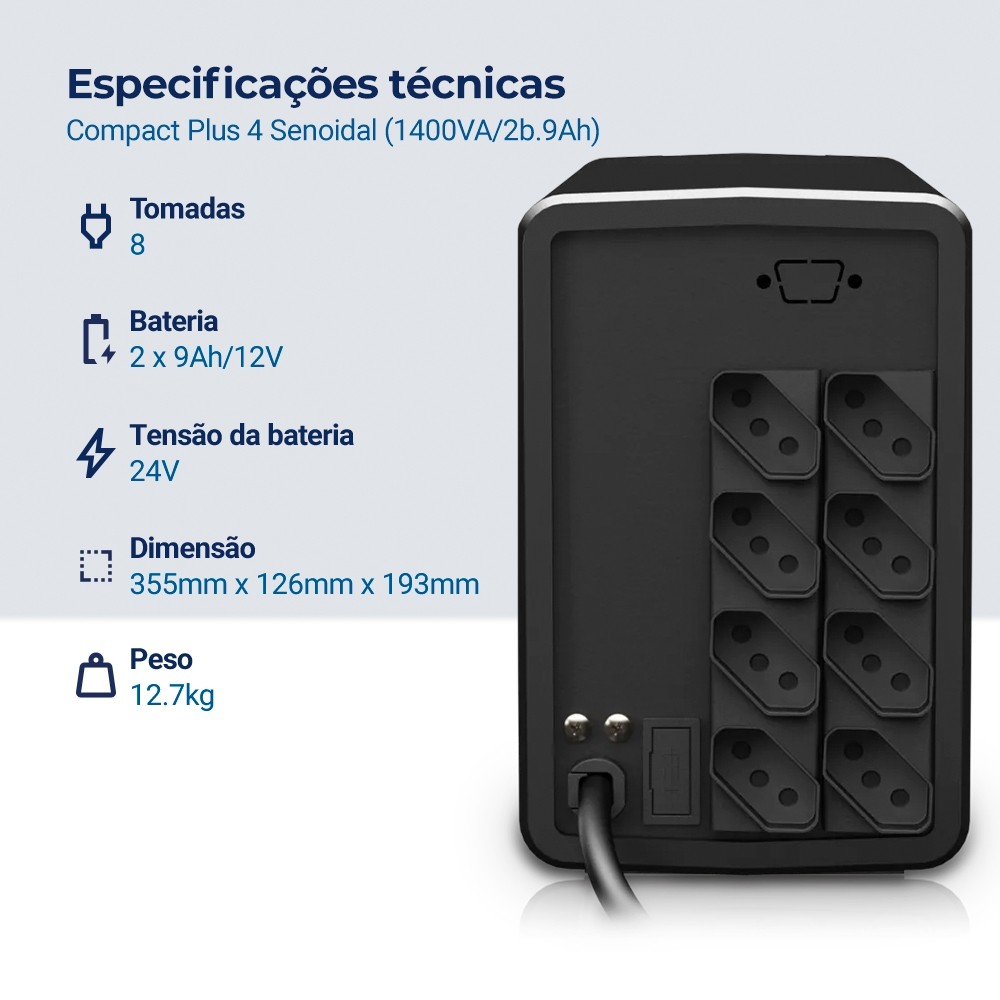 Nobreak NHS Compact Plus 4 Senoidal 91.B0.A01400 Entrada Bivolt Saída 120V (1400VA/2b.9Ah)