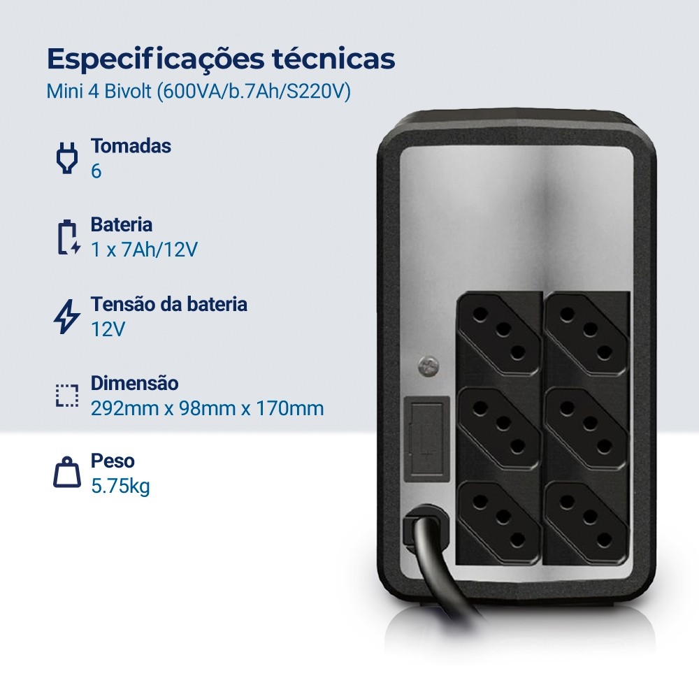Nobreak NHS Mini 4 Bivolt 600VA, Bateria de 7Ah/S, 220V O Nobreak NHS Mini 4 Bivolt 600VA, com bateria de 7Ah, é a escolha ideal para quem precisa de proteção confiável e contínua contra quedas e oscilações de energia em ambientes de 220V. Projetado para dispositivos eletrônicos de pequeno a médio porte, como roteadores, modems, e sistemas de segurança, este nobreak garante que seus equipamentos permaneçam em funcionamento em momentos críticos. Com entrada bivolt e saída 220V, ele adapta-se automaticamente a diferentes voltagens, proporcionando maior versatilidade. O design compacto e resistente permite uma instalação fácil e segura em qualquer ambiente, sendo uma opção prática e eficiente para proteção diária de energia. Características Principais: Bivolt com Saída 220V: Oferece versatilidade para adaptação em diferentes fontes de energia. Bateria de 7Ah: Proporciona autonomia suficiente para manter equipamentos funcionando em momentos de queda de energia. Proteção Completa: Contra sobrecargas, surtos e oscilações, garantindo segurança e estabilidade. Design Compacto: Ideal para pequenos espaços, é fácil de instalar e operar em residências e escritórios. Especificações Técnicas: Potência: 600VA Voltagem Entrada: 220V - 120V Voltagem Saída: 120V (220V Configurável) Saída: 220V Bateria: 7Ah Aplicação: Nobreak confiável para proteger PDVs, caixas registradoras e sistemas de automação contra oscilações de energia. Perfeito para ambientes comerciais que dependem de estabilidade para operar. Garantia: 24 meses de garantia direto com o fabricante (Nobreak) - 12 meses de garantia direto com o fabricante (Bateria) Referência: NO005