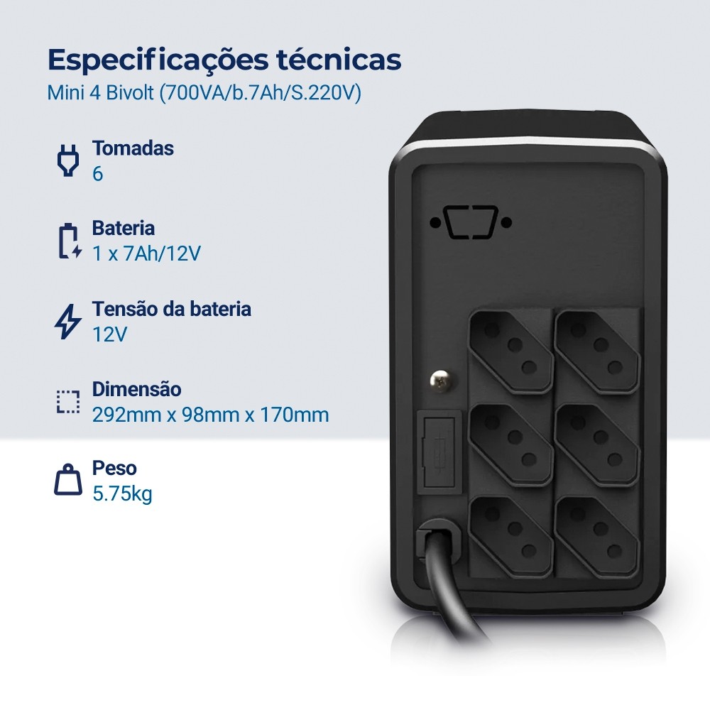 Nobreak NHS Mini 4 90.B1.007101 Entrada Bivolt Saída 220V (700VA/b.7Ah)