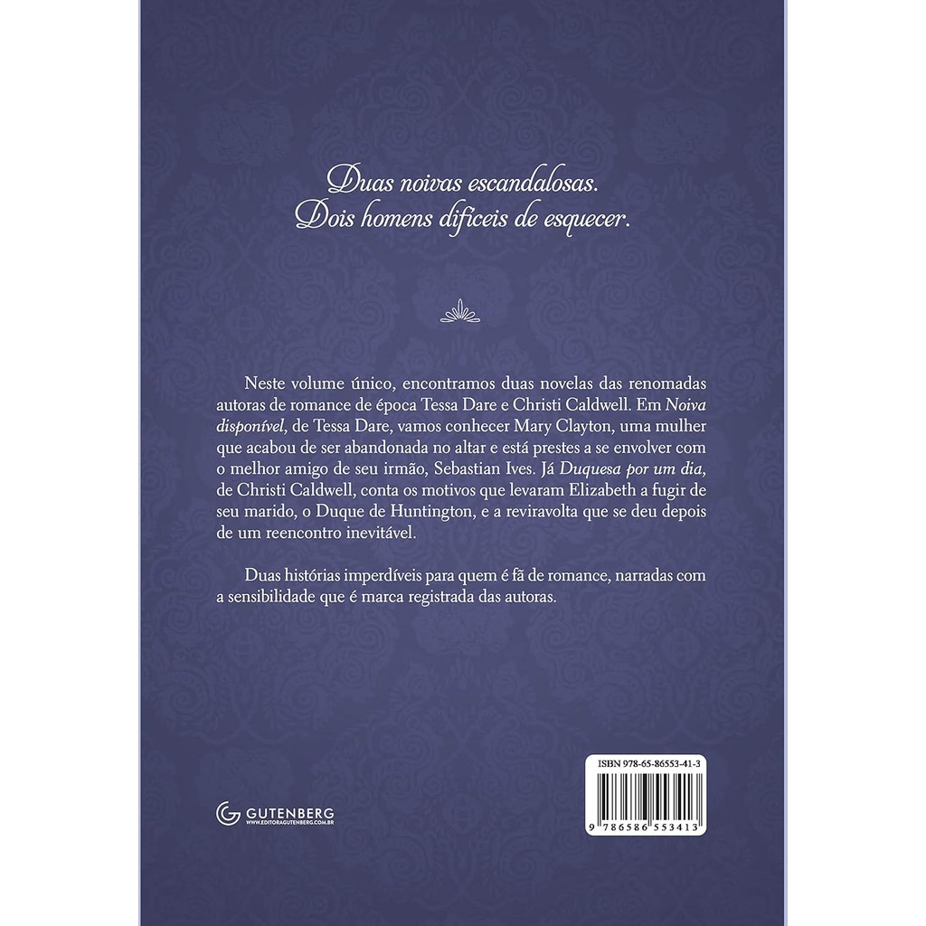 Duas noivas escandalosas. Dois homens difíceis de esquecer.Neste volume único, encontramos duas novelas das renomadas autoras de romance de época Tessa Dare e Christi Caldwell. Em Noiva disponível, de Tessa Dare, vamos conhecer Mary Clayton, uma mulher que acabou de ser abandonada no altar e está prestes a se envolver com o melhor amigo de seu irmão, Sebastian Ives. Já Duquesa por um dia, de Christi Caldwell, conta os motivos que levaram Elizabeth a fugir de seu marido, o Duque de Huntington, e a reviravolta que se dá depois de um reencontro inevitável. Duas histórias imperdíveis para quem é fã de romance, narradas com a sensibilidade que é marca registrada das autoras.Novela 1 Noiva disponível, de Tessa Dare Há uma regra entre cavalheiros que não pode ser quebrada: jamais tocar na irmã do melhor amigo. Sebastian Ives nunca fora homem de seguir regras e sempre lutou para resistir aos encantos de Mary Clayton, a irmã de seu melhor amigo. Mas, quando o noivo dela a abandona no altar, só Sebastian pode salvá-la da ruína. Ele irá se manter fiel ao amigo? Ou a tentação de tomar Mary nos braços será ainda mais irresistível?Novela 2 Duquesa por um dia, de Christi Caldwell Crispin Ferguson, o Duque de Huntington, passou os últimos anos mergulhado em tristeza. A jovem com quem havia se casado, Elizabeth Brightly, partiu sem dizer nada, e a fuga apressada de sua esposa teve repercussões devastadoras. Mas Crispin nunca deixou de pensar em sua amada. E, agora que a encontrou, tem um pedido a fazer: que ela seja sua duquesa, publicamente, apenas por um dia. Tal reencontro irá reatar os laços que os uniram no passado? Ou uma revelação devastadora pode separá-los para sempre?
