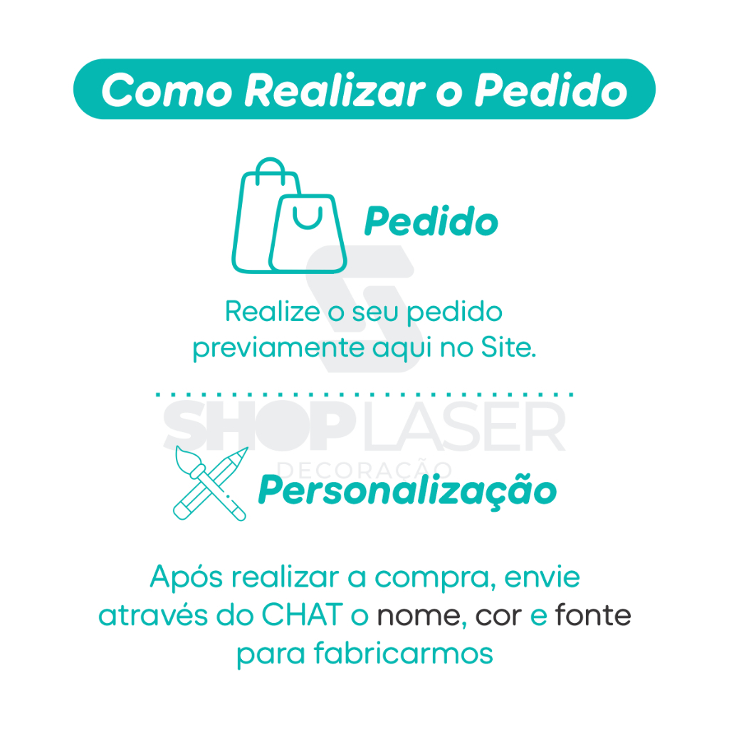 ✅ Após a compra, envie o nome e a cor desejada pelo chat. Caso não sejam informadas a fonte e a cor, utilizaremos o padrão para produção: Fonte 1 | Nome feminino: Rose Gold | Nome masculino: Dourado. 🔹 Nome Composto: Para nomes compostos, produzimos nas medidas de 60cm ou 80cm, garantindo melhor proporção e legibilidade. 📏 Opções de Medidas: 40 cm de largura (altura aproximada de 12 cm) 50 cm de largura (altura aproximada de 16 cm) 60 cm de largura (altura aproximada de 20 cm) 80 cm de largura (altura aproximada de 23 cm) Observação: A altura pode variar conforme a quantidade de letras do nome. 📦 Acompanha: Película protetora no acrílico espelhado, garantindo maior segurança durante o transporte. Fita dupla face já aplicada, para facilitar a instalação. Molde de posicionamento 🔐 Importante: Para maior segurança e integridade durante o transporte, algumas letras do nome podem ser enviadas separadamente. Isso não compromete o resultado final, pois o gabarito facilita a instalação correta. 🧼 Cuidados com o produto: Limpar apenas com pano macio e seco. Não utilizar álcool, produtos abrasivos ou umedecidos. Aplicar em superfície lisa, limpa e seca. Utilize apenas a fita fornecida. Ao receber, manusear com cuidado, pois trata-se de um material delicado. Atenciosamente, Equipe Shop Laser