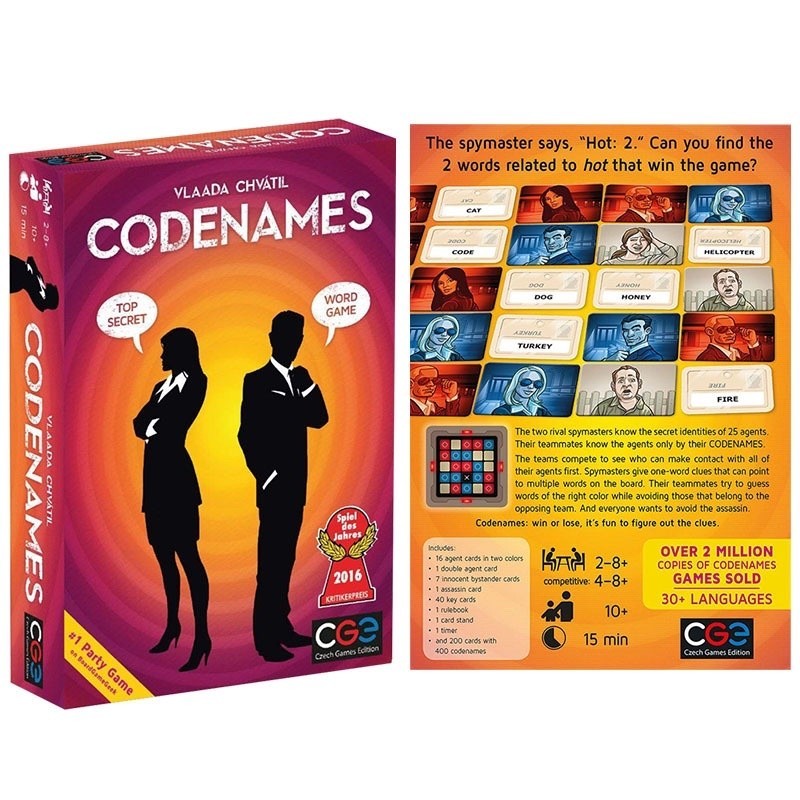 **|Quadros DE CÓDIGOS|** Codenames Imagens é o jogo de imagens secreto superior onde dois spymasters rivais conhecem o agente em cada local. Eles oferecem mensagens codificadas dizendo a seus cooperativos de campo onde ir para reuniões de clandestine. Os operativos operativos devem ser inteligentes. Um erro de decodificação pode levar A um encontro desagradável com um agente inimigo - ou pior, com o assassino. |Especificações da Especificações| Condição do produto: Novo em folha Número de jogadores: 2-8 Tempo de jogo de 15 minutos Idade adequada: 10+ O produto inclui: 14 cartões de agente, 1 cartão de agente duplo, 4 cartões de dispensador, 1 cartão assassino, 60 cartões-chave, 1 regrabook, 1 suporte para cartão, 140 cartões de imagem **|Capa ÍNTIMA 2.0|** Este é um adulto apenas, versão madura dos codinomes usando a mesma mecânica de jogo popular, mas apresenta todas as novas palavras, embalagem, “por-padrões” e arte. Adiciona-se uma nova torção com A inclusão de cartas em branco, permitindo que os jogadores apresentem suas próprias palavras ao jogo uma nova torção com A inclusão de cartas em branco, permitindo que os jogadores apresentem suas próprias palavras ao jogo. Pode ser jogado como um jogo autônomo ou combinado com outros títulos Codenames. |Especificações da Especificações| Condição do produto: Novo em folha Número de jogadores: 4-8 Tempo de jogo de 15 minutos Idade adequada: 18+ O produto inclui: 16 cartões de agente, 1 cartão de agente duplo, 7 cartões de bystander, 1 cartão assassino, 40 cartões-chave, 1 regrabook, 195 cartões com nomes, 5 cartões de codinome DIY. #codenames #codenamesduet #codenamespictures #codenamesdeepundercover #worddeductiongame #guessinggame #spygame #wordgame #strategygame #partygames #boardgames #boardgame #familygames #cards #cardgames