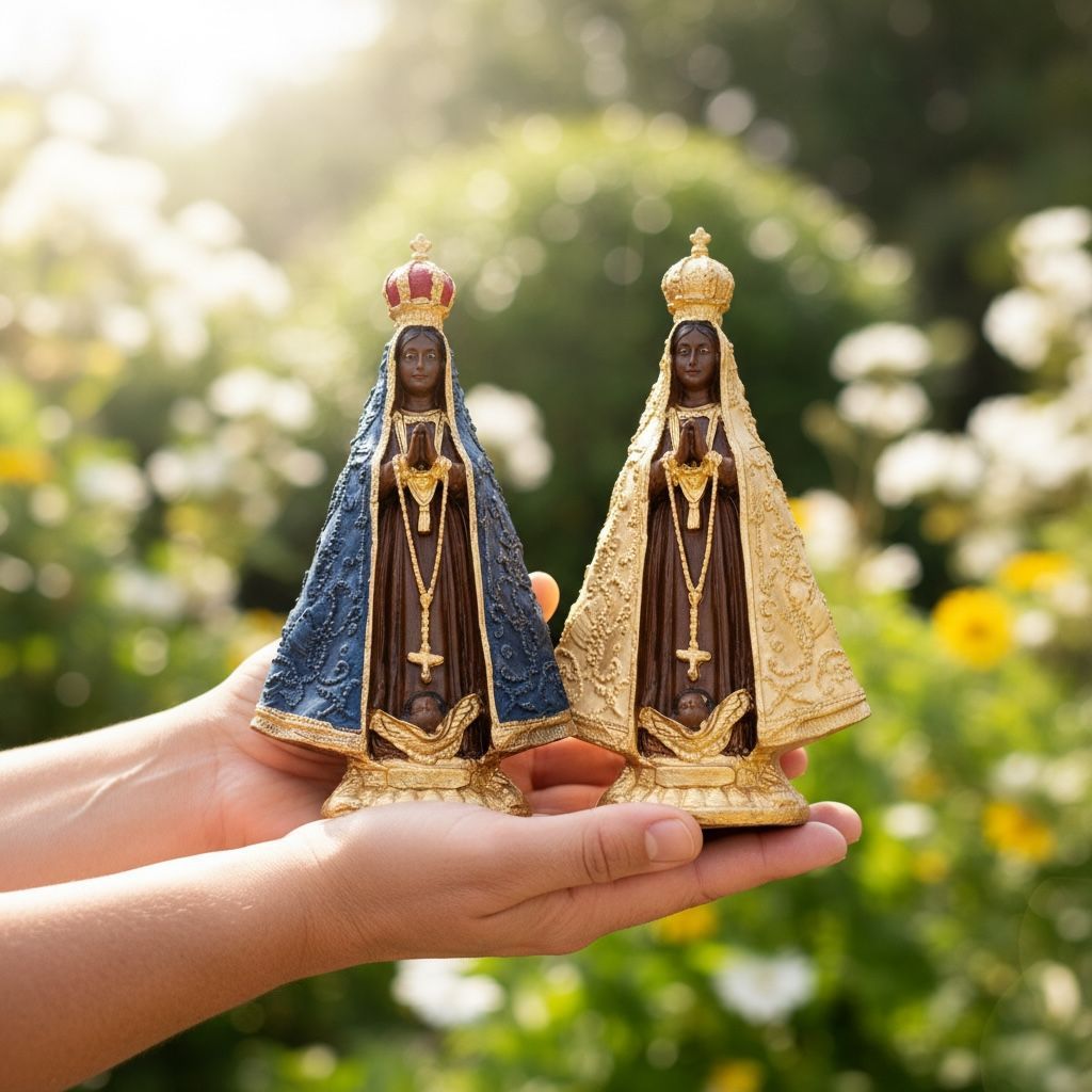 Imagem de gesso de Nossa Senhora Aparecida, padroeira do Brasil, representada com seu manto tradicional nas cores azul ou dourada, simbolizando proteção, fé e realeza espiritual. A peça apresenta ricos detalhes, com acabamento delicado e pintura refinada que destaca os ornamentos do manto e a coroa, transmitindo devoção e elegância.