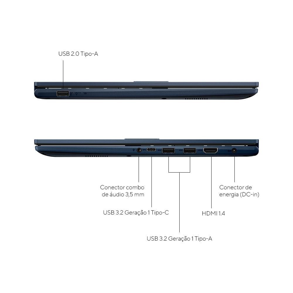 Características Processador Intel Core™ i5 - 13ª Geração Sistema Operacional Windows 11 Home Sistema Operacional Windows pré-instalado no produto, não acompanha mídia Memória 8GB HD 512GB SSD Tela Tamanho da Tela: 15,6" Resolução da Tela: FHD Rede Placas PCIe Conexão Wireless Placas PCIe Bluetooth Sim Áudio Efeitos de Áudio Microfone Integrado Webcam Integrada -720p (HD - High Definition) Portas Frontais/Laterais/Traseiras 1 x HDMI 4 x USB 1 x Saída Fone de Ouvido Mouse Touchpad Tradicional (Resistivo ou de Membrana) Bateria Íons de Lítio Duração: 8hs Cor Quiet Blue EAN 7908737300772 Especificações Técnicas Modelo: X1504VA-NJ1743W Garantia: 12 meses Dimensões e Peso Dimensões do produto sem embalagem (AxLxP): 17,9 x 359,7 x 232,5 mm Dimensões do produto com embalagem (AxLxP): 65 x 481 x 288 mm Peso do produto sem embalagem: 1,7 kg Peso do produto com embalagem: 2,5 kg Itens Inclusos 01 Notebook 01 Carregador Manual de Instruções Agente Validador Produto possui certificação de segurança compulsória, certificado pela Anatel - 00595-18-04423, organismo acreditado pela CGCRE do Inmetro.