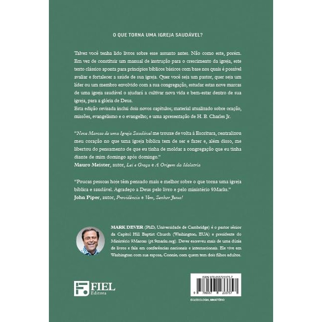 O QUE TORNA UMA IGREJA SAUDÁVEL? Talvez você tenha lido livros sobre esse assunto antes. Não como este, porém. Em vez de constituir um manual de instrução para o crescimento da igreja, este texto clássico aponta para princípios bíblicos básicos com base nos quais é possível avaliar e fortalecer a saúde de sua igreja. Quer você seja um pastor, quer seja um líder ou um membro envolvido com a sua congregação, estudar estas nove marcas de uma igreja saudável o ajudará a cultivar nova vida e bem-estar dentro de sua igreja, para a glória de Deus. Esta edição revisada inclui dois novos capítulos; material atualizado sobre oração, missões, evangelismo e o evangelho; e uma apresentação de H. B. Charles Jr. “Nove Marcas de uma Igreja Saudável me trouxe de volta à Escritura, centralizou meu coração no que uma igreja bíblica tem de ser e fazer e, além disso, me libertou do pensamento de que eu tinha de moldar a congregação que eu tinha diante de mim domingo após domingo.” Mauro Meister , autor, Lei e Graça e A Origem da Idolatria “Poucas pessoas hoje têm pensado mais e melhor sobre o que torna uma igreja bíblica e saudável. Agradeço a Deus pelo livro e pelo ministério 9Marks.” John Piper , autor, Providência e Vem, Senhor Jesus! 16x23cm 277 Páginas