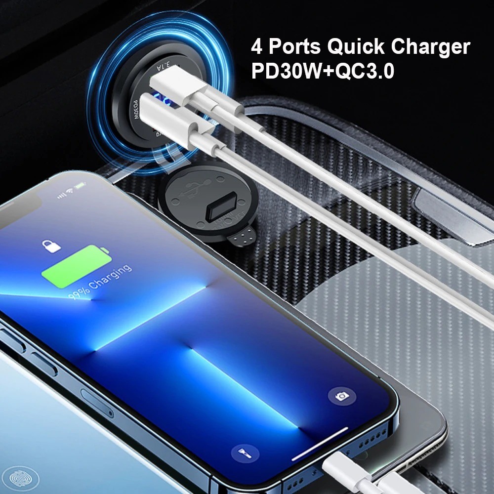 Especificações do produto: 1. Capacidade de carregamento quadrado: Quatro portas de carregamento no total, incluindo 2 portas USB-A e 2 portas USB-C, permitindo carregamento simultâneo de vários dispositivos. 2. Saída de alta potência Total de até 83W garante carregamento rápido e eficiente para todos os dispositivos conectados. 3. Velocidades de carregamento variável: PD30W (5V/3A, 12V/2.5A) Carregador Rápido USB 22,5W 22.5W (5V/3A, 9V/2.5V) USB 3.1A (15.5W,5V/3.1A) Tipo C (15.5W,5V/3.1A) 4. Voltímetro Integrado: O voltímetro embutido proporciona monitoramento em tempo real da tensão da bateria, garantindo ótimas condições de carregamento e promovendo operação segura. 5. Design à prova de poeira: Equipado com uma capa à prova de poeira para proteger as portas de poeira e detritos quando não estiver em uso, mantendo a limpeza e prolongando a vida útil da saída. Nota: Se você encontrar o produto não funciona após a instalação, verifique se há algumas condições: 1. O interruptor do produto está ligado? 2. Os postes positivos e negativos são revertidos? 3. O fusível é o fusível na fiação soprado? 4.Se a fonte de alimentação está com falta de eletricidade? Por favor, sinta-se à vontade para nos informar se há um problema defeituoso com o produto, responderemos online dentro de 24 horas!