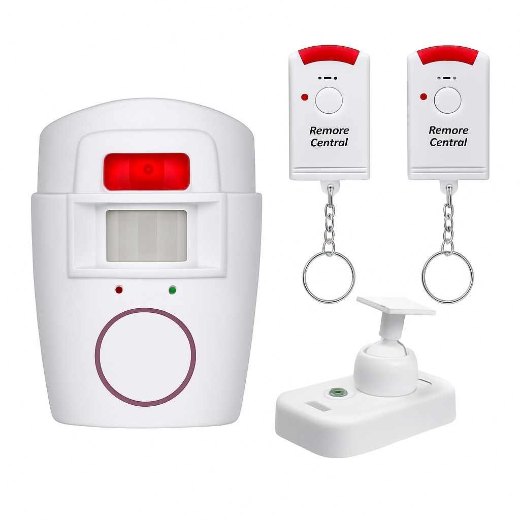 Novo - Alarme Sensor Movimento 110° 10m 105dB 2 Controles Remoto Montagem Fácil Pilha AA Casa.