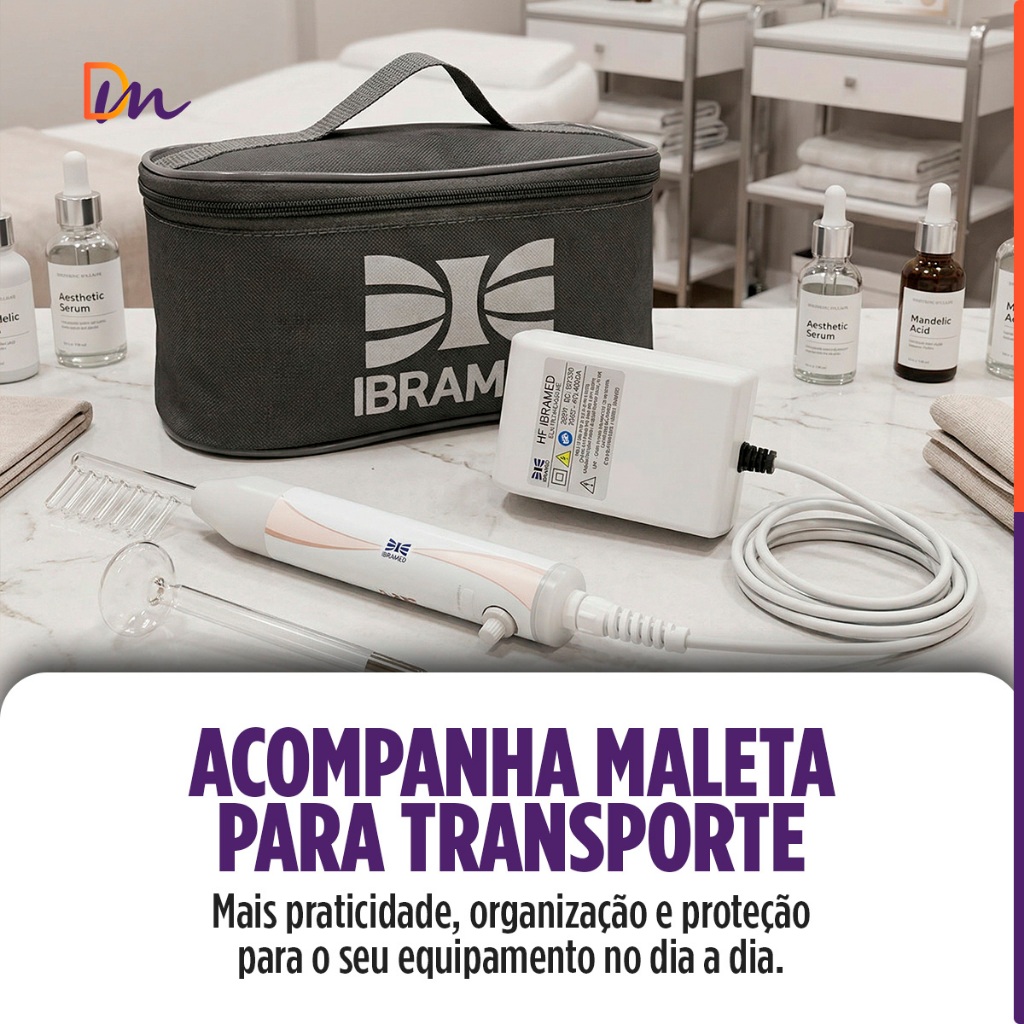 NOVO HF DE ALTA FREQUÊNCIA IBRAMED ESTÉTICA FACIAL CAPILAR BIVOLT + 2 ELETRODOS Registro Anvisa N° 10360310020. ⚠️ INFORMAÇÃO IMPORTANTE Este equipamento acompanha bolsa para transporte, que poderá ser enviada na cor azul ou cinza, de acordo com a disponibilidade em estoque. A escolha da cor não é possível. O envio é feito de forma aleatória. O HF Alta Frequência Ibramed é um equipamento profissional portátil, desenvolvido para tratamentos estéticos faciais, capilares, corporais e podológicos. Conta com caneta aplicadora com encaixe universal para eletrodos de vidro, permitindo praticidade, agilidade e eficiência durante os atendimentos. O controle de intensidade é realizado diretamente na caneta, tornando o uso mais intuitivo e preciso. Compacto, leve e funcional, é ideal para profissionais que realizam atendimentos em clínica ou home care. PRINCIPAIS BENEFÍCIOS - Alta frequência com ação bactericida e antisséptica. - Equipamento portátil e fácil de transportar. - Controle de intensidade direto na caneta. - Encaixe universal para eletrodos de vidro. - Ideal para estética facial, capilar e podologia. - Tratamento seguro, não invasivo e indolor. - Excelente para profissionais iniciantes e avançados. INDICAÇÕES DE USO - Pós-depilação. - Tratamento de lesões podais. - Facilitação na permeação de ativos. - Desinfecção do couro cabeludo. - Cauterização da pele pós-extração de pústulas. - Protocolos de hidratação e revitalização da pele. - Tratamento de acne e pele acneica. - Estímulo da circulação sanguínea facial e capilar. - Cicatrização de feridas, úlceras e lesões. - Tratamentos capilares e podológicos. EFEITOS FISIOLÓGICOS - Ação bactericida, fungicida e germicida. - Ação antisséptica. - Aumento da oxigenação celular. - Vasodilatação e hiperemia. - Ativação da circulação periférica. - Estímulo à produção de colágeno. - Melhora do trofismo dérmico. - Aceleração do processo de cicatrização. ⚠️ CONTRAINDICAÇÕES - Epilepsia. - Tumores no local. - Alergia à corrente. - Processos infecciosos. - Insuficiência renal ou cardíaca. - Gestantes ou tentativa de engravidar. - Hipertensão e diabetes descompensados. - Trombose venosa profunda. - Portadores de marca-passo ou dispositivos eletrônicos implantados. - Aparelhos auditivos devem ser removidos durante o uso. ESPECIFICAÇÕES TÉCNICAS Marca: Ibramed Modelo: Hf. Peso Bruto: 900 Gramas. Modo: Contínuo. Frequência: 60 Hz. Dimensões (LxPxA): 7 cm x 11 cm x 6 cm. Alimentação Bivolt 127/220V / 50/60Hz – (Seleção Manual). Peso aproximado do produto sem eletrodo: 520 Gramas. ITENS INCLUSOS 01- Equipamento HF Ibramed Bivolt. 01- Manual de Instruções digital. 01- Maleta Para Transporte. 01- Eletrodo Pente Para Alta Frequência. 01- Eletrodo Esférico (Cebolão) Para Alta Frequência. GARANTIA Garantia de 18 meses para o equipamento e 3 meses para acessórios sujeitos a degaste, diretamente com o fabricante. FAQ - DERMOMED 1. Esse aparelho é profissional ou pode ser usado em casa? Resposta: O HF Ibramed é um equipamento profissional e deve ser utilizado por profissionais qualificados ou sob orientação adequada para garantir segurança e melhores resultados. 2. O aparelho já vem pronto para uso? Resposta: Sim, o equipamento é bivolt e acompanha eletrodos e maleta, sendo necessário apenas seguir as instruções do manual para iniciar o uso corretamente. 3. Serve para tratamento de acne e limpeza de pele? Resposta: Sim, é indicado para tratamento de acne, desinfecção da pele e procedimentos estéticos como limpeza de pele, devido à sua ação bactericida e antisséptica. 4. Posso usar qualquer eletrodo de alta frequência? Resposta: Sim, o equipamento possui encaixe universal, sendo compatível com eletrodos de vidro padrão do mercado. 5. O produto é original e possui registro na Anvisa? Resposta: Sim, é um equipamento original Ibramed e possui Registro Anvisa nº 10360310020, garantindo segurança e qualidade.