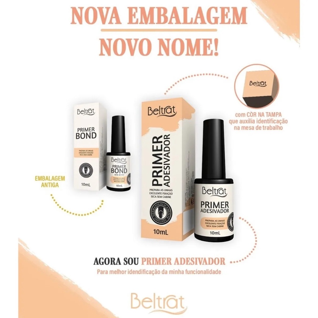 Composição do anúncio: 01x Primer Adesivador 10ml - Beltrat Perfeito para a melhor fixação das unhas e as prepara para receber os produtos em gel, funciona como uma fita dupla face. Ideal para alongamentos, para melhor fixação nas unhas de gel, acrigel, fibra de vidro, acrílica e porcelana, auxiliando numa estrutura mais sólida. - Frasco com 10 ml; - Dermatologicamente testado; - Secagem natural sem cabine. MODO DE USO Após polimento das unhas naturais, aplicar o desidratador e em seguida cuidadosamente o Primer ácido com o pincel bem escorrido e sem encostar nas cutículas e em seguida o Primer Bond.
