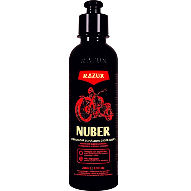 NUBER RENOVADOR DE PLÁSTICOS E BORRACHAS 240ML RAZUX DESCRIÇÃO: Desenvolvido para renovar e proteger plásticos e borrachas de motocicletas. MODO DE USO: - Após limpar o plástico, coloque algumas gotas do produto em um aplicador de espuma. - Espalhe o produto de maneira uniforme e faça acabamento até a uniformidade total.