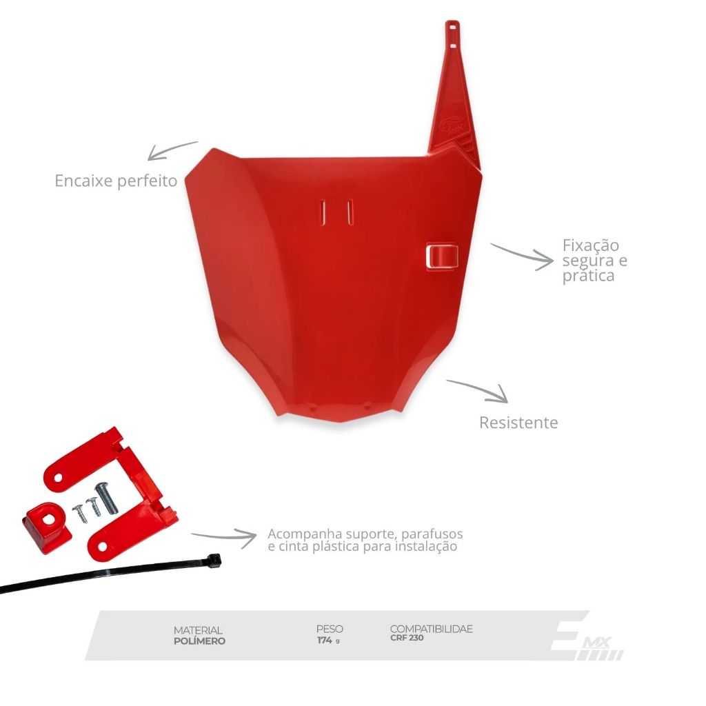 Estilo, encaixe perfeito e liberdade para personalização! O Number Plate AMX F21 foi desenvolvido especialmente para a CRF 230F (2007 a 2021), inspirado no visual agressivo da CRF 450R de motocross. Fabricado por injeção plástica de alta qualidade, garante resistência e acabamento impecável. Conta com área ampliada para aplicação de gráficos, permitindo personalizações únicas para destacar sua moto nas trilhas ou no urbano. APLICAÇÃO: CRF 230 TODAS CONTEÚDO: 01 NUMBER PLATE F21 01 SUPORTE PARA FIXAÇÃO ______________ ELITE MX