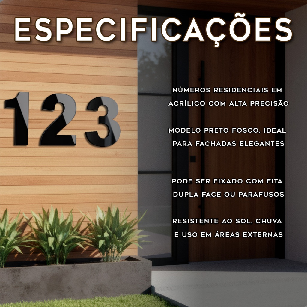 Escolha a Variações, Escolha Entre: 0, 1, 2, 3, 4, 5, 6, 7, 8, 9. Número residencial em acrílico preto de 20 cm com corte a laser, perfeito para identificar casas, apartamentos ou comércios com estilo moderno e acabamento profissional. Benefícios para Adquirir: Design elegante e fácil de visualizar à distância Corte a laser com bordas precisas e acabamento refinado Acrílico resistente às variações climáticas Tamanho ideal para fachadas, muros ou portões Instalação simples com fita dupla face ou parafuso Características Técnicas: Material: Acrílico de alta qualidade Cor: Preto Altura: 20 cm Espessura: Aproximadamente 3 mm Corte: A laser Aplicação: Uso externo ou interno Cuidados ou Informações Adicionais: Limpar com pano macio e seco ou levemente umedecido Não utilizar produtos abrasivos Pode ser fixado com fita dupla face forte ou parafusos (não inclusos) Produto enviado com película protetora para evitar riscos Adicione estilo e visibilidade ao seu endereço com esse número residencial em acrílico preto de 20 cm. Garanta já o seu e modernize sua fachada!