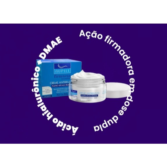 Enriquecido com ácido hialurônico nano-encapsulado. Hidrata profundamente e preenche rugas e linhas de expressão. possui ação firmadora. 100% de Eficácia comprovada no aumento da firmeza da pele, redução de flacidez e melhora na aparência da pele. Tão conhecido no mercado de skincare, o ácido hialurônico possui propriedades hidratantes e firmadoras já conhecidas e comprovadas. A Nupill acaba revolucionar mais uma vez e traz uma evolução deste queridinho ativo, que agora com a Nano Tecnologia possui até 30% a mais de eficácia que o Ácido Hialurônico já disponível no mercado. O creme antirrugas Nupill Nano Hyaluronic foi desenvolvido com eficácia comprovada para reduzir rugas e firmar a pele na região do rosto e pescoço. A combinação de ácido hialurônico nano encapsulado e DMAE é perfeita para uma pele mais viçosa, firme e hidratada. Original - Envio Rápido com Nota Fiscal.
