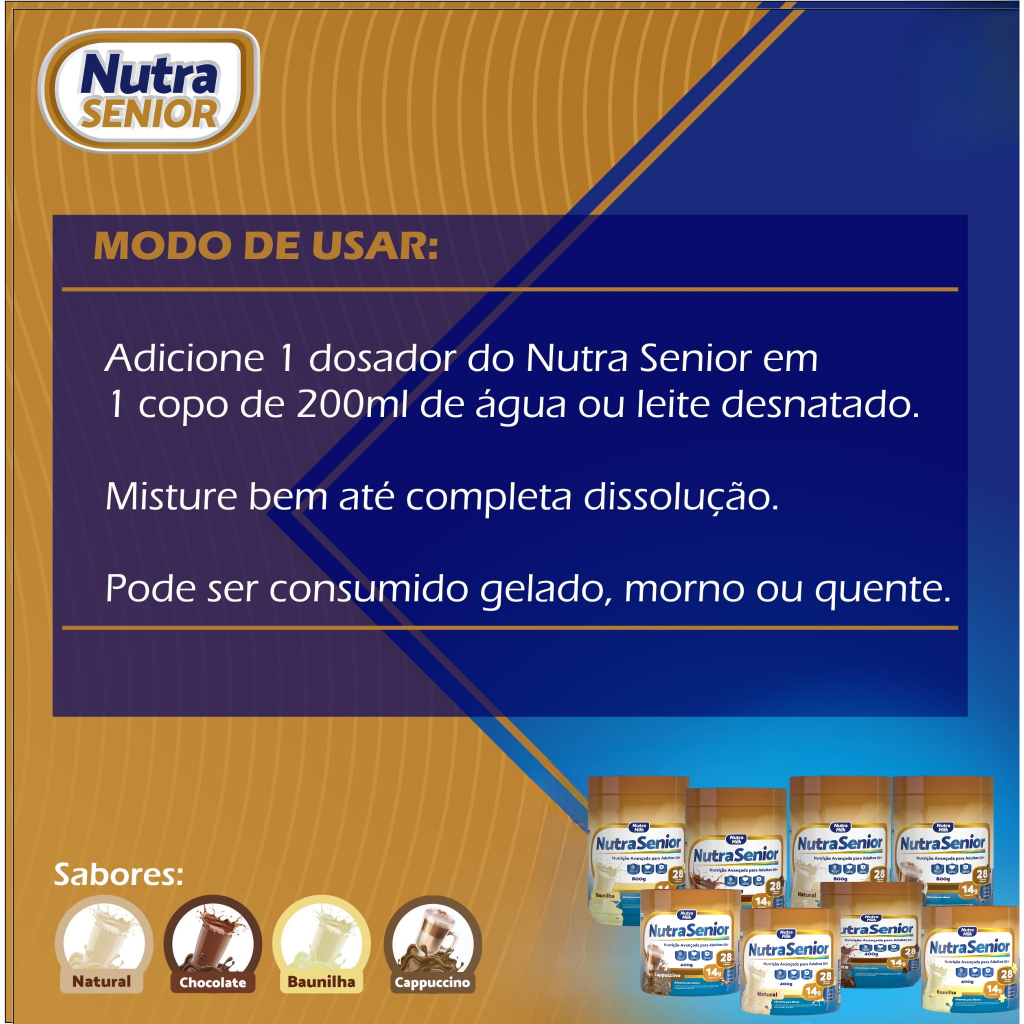 Nutra Senior 50+ é um suplemento nutricional desenvolvido com alta tecnologia pela indústria Alimentícia Nutramilk, visando o equilíbrio nutricional e a melhora da saúde em geral. Desenvolvido especialmente para pessoas acima de 50 anos, Nutra Senior 50+ oferece em sua fórmula 28 ingredientes ricos em vitaminas e minerais e um sabor delicioso. É um suplemento completo para quem busca um suporte para a alimentação equilibrada e saudável. Seu formato em pó facilita a ingestão e sua fórmula foi cuidadosamente elaborada para atender às necessidades específicas dessa faixa etária. Principais características: - Fórmula com 28 Vitaminas e Minerais; - Rico em Vitaminas e Minerais; - Rico em nutrientes essênciais; - Zero Glúten. Principais Nutrientes: VITAMINA e CÁLCIO: Auxiliam para manutençãos dos Ossos mais fortes. FERRO: Auxilia na produção de células vermelhas. VITAMINAS DO COMPLEXO B: Contribuem para produção e liberação de energia. VITAMINA C e ZINCO: Contribuem para o fortalecimento do sistema imunológico. CÁLCIO e Potássio: Fortalecimento dos Ossos e dentes. ZINCO: ajuda na saúde imunológica,na cicatrização e na saúde da pele. MAGNÉSIO: Ajuda na saúde cardiovascular e na regulação do açúcar no sangue. MODO DE USAR: Adicione 1 dosador do Nutra Senior 50+ em 1 copo com 200ml de água (pode ser quente ou gelada). Misture bem até a completa dissolução. INFORMAÇÕES NUTRA SENIOR 50+ - Sabores: Chocolate / Baunilha / Cappuccino / Natural (Sem sabor). - Potes de 400g e 800g. Nutra Senior 50+ Aproveite todos os benefícios que esse suplemento pode oferecer e desfrute de uma vida mais saudável e ativa.