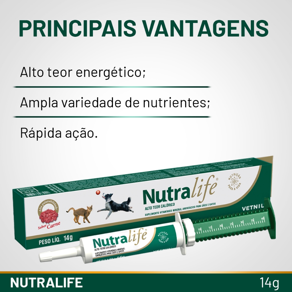 A LeluPets nasceu de uma paixão e dedicação de aproximadamente 20 anos de experiência nessa área tão incrível. Desde o início de nossa história, já são mais de 100 mil clientes atendidos. Estamos aqui determinados em fazer a diferença, democratizando e simplificando o cuidado com o seu pet para oferecer a melhor experiência para você e seu amiguinho. Mantemos nossas orelhas em pé, atentos às novidades do mundo pet para trazê-las até você. Nós somos apaixonados por pets! O seu pet é também da nossa família! Nutralife Suplemento Vitamínico Para Cães e Gatos14g Vetnil O Suplemento Vitamínico Nutralife da Vetnil é muito indicado para cachorros e gatos em crescimento, treinamento físico, idosos, fêmeas prenhes e lactantes. Produto naturalmente energético assessorando em um melhor estado nutricional, tendo uma rápida absorção, estimula o apetite e ótimo para performance de animais em treinamentos. Garantindo a nosso amiguinho um ótimo estilo de vida saudável, com disposição, bem-estar e muita alegria. - Indicado para cachorros e gatos de todas as idades; -Suplemento Vitamínico; - Via oral; -Garantindo um bom aporte nutricional e vitamínico; -Sabor carne; -Seringa com 14g; - Atente-se à NUTRALIFE bula e/ou informações da embalagem; - Consulte um médico veterinário de sua confiança para o uso apropriado deste produto; - Embalagem com 1 seringa de 14g.