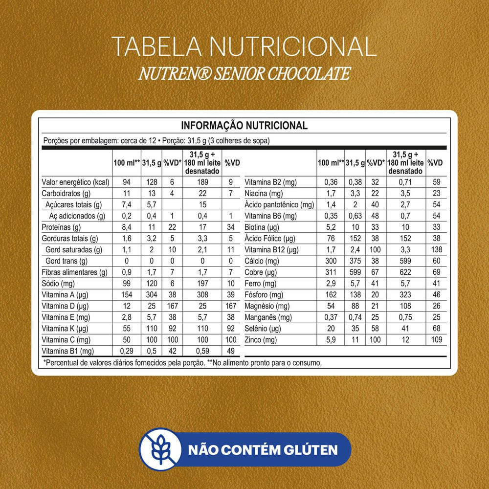 Complemento Alimentar Nutren Senior Chocolate O Nestlé Nutren Senior sabor Chocolate é um suplemento nutricional para pessoas acima dos 50 anos aproveitarem a melhor fase da vida com saúde e disposiçã