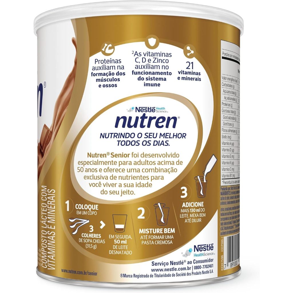 Nutren Senior Pó Chocolate 370G Suplemento Alimentar Nestlé Principais Características: • Sabor chocolate, proporcionando uma experiência de consumo agradável e saborosa. • Fórmula enriquecida com proteínas, vitaminas e minerais essenciais para adultos e idosos. • Pronto para preparo rápido, facilitando a incorporação à rotina alimentar. Benefícios: • Contribui para a manutenção da energia e vitalidade em pessoas acima de 50 anos. • Auxilia na saúde óssea e muscular, promovendo força e bem-estar. • Fácil digestão e versatilidade, podendo ser consumido com leite, água ou outras bebidas. Diferenciais do Produto: • Suplemento alimentar especialmente formulado para atender às necessidades nutricionais de adultos e idosos. • Sabor chocolate diferenciado, tornando a ingestão diária mais prazerosa. • Fonte de nutrientes essenciais, garantindo suporte nutricional completo. Especificações Técnicas: • Peso: 370g Instruções de Uso: • Adicionar a quantidade recomendada conforme instruções do rótulo ou orientação do nutricionista em leite, água ou bebida de sua preferência. • Misturar bem até completa dissolução antes de consumir. • Pode ser consumido diariamente como complemento nutricional. Avisos e Precauções: • Conservar em local seco e fresco. • Manter o produto bem fechado após o uso para preservar a qualidade. • Produto destinado ao consumo de adultos e idosos; não substituir refeições completas sem orientação médica. O que está incluso? • 1 Nutren Senior Pó Chocolate 370G Suplemento Alimentar Nestlé ---- DÚVIDAS FREQUENTES ---- Os produtos são originais? Sim. Todos os nossos produtos são originais. Emitem nota fiscal? Sim. Emitimos nota fiscal para todos os pedidos.