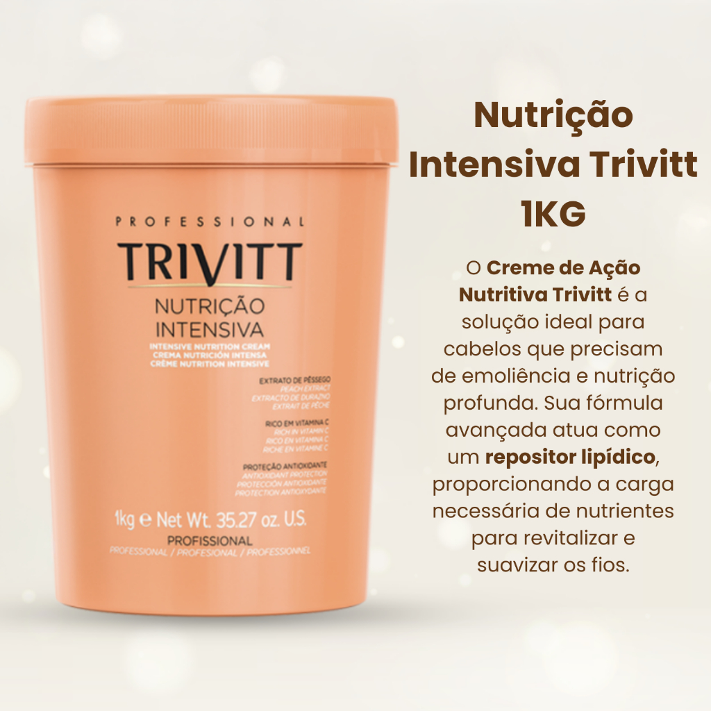 Trivitt Nutrição A linha de nutrição capilar é a etapa do cronograma capilar que repõe os lipídios (gorduras) dos fios, ajudando a selar as cutículas e a reter a água. É indicada quando o cabelo está exposto ao sol, vento, poluição e processos químicos (oxidação). Nutrição Intensiva: é um creme de ação nutritiva, tem a função de repositor lipídico com carga de nutrição especifica para cabelos que necessitam de emoliencia ATIVOS: Possui: Manteiga de Manga, Éster Cetílico de Karité, Extrato de Pêssego. MODO DE USO: Depois do Shampoo, aplique nos cabelos limpos e úmidos massageando do comprimento as pontas. Deixe agir por 5 minutos e enxágue
