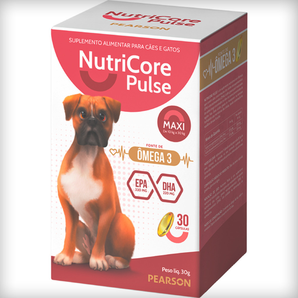 - Rico em ômega-3, combate o aumento do colesterol; - Ajuda no desenvolvimento e melhora o sistema cognitivo; - Ação antioxidante, atuando na prevenção de doenças degenerativas; - Auxilia na saúde cardiovascular, melhorando o metabolismo do coração. * Consulte sempre o Médico Veterinário de sua confiança para o uso apropriado deste produto. Leia a bula ou informações descritas na embalagem. Detalhes O Suplemento Alimentar NutriCore Pulse Maxi 330 mg é enriquecido com ômega-3, trazendo diversos benefícios para o funcionamento cardiovascular de cães e gatos. Sua fórmula auxilia no metabolismo do miocárdio, desempenha função antioxidante e reduz os níveis de colesterol, além de contribuir para o funcionamento cognitivo. Recomendado para gatos e cães de 10 kg a 30 kg. Dicas Especiais O uso de suplementos é ideal para balancear a dieta do seu amigão e trazer nutrientes que geralmente não estão presentes em rações, mas não esqueça de manter a rotina de alimentação com auxílio e validação de um médico veterinário. Composição NutriCore Pulse é um suplemento alimentar que contém Ômega 3 com altas concentrações de ácidos Eicosapentaenóico (EPA) e Docosahexaenóico (DHA), que são ácidos graxos provenientes do óleo de peixes de regiões frias.