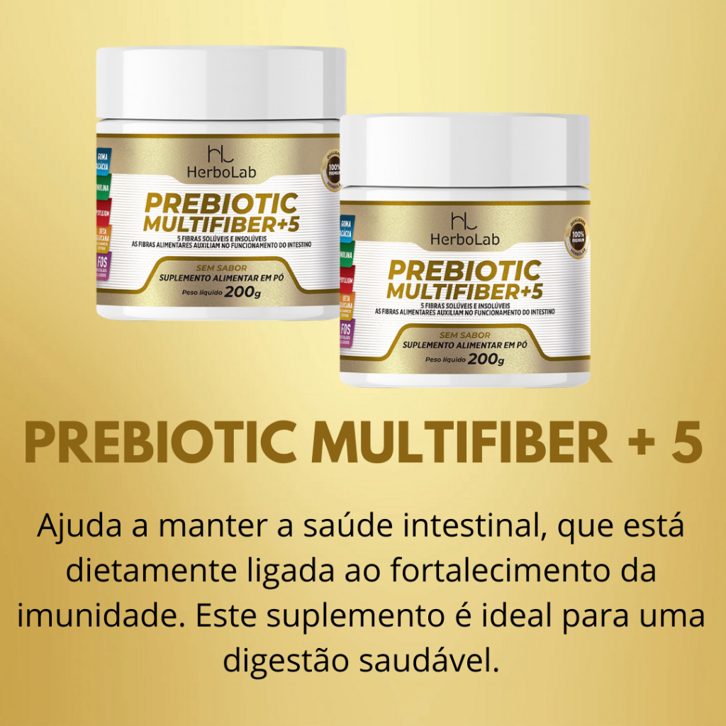 DESCRIÇÃO: O Prebiotic Multifiber + 5 da Herbolab é um suplemento alimentar de fibras em pó, composto por 5 fibras solúveis e insolúveis que auxiliam no bom funcionamento do intestino. Sem sabor, podendo ser diluído emágua, sucos, ou bebida de sua preferência, facilitando sua ingestão. BENEFÍCIOS As fibras alimentares auxiliam no funcionamento do intestino. DIFERENCIAIS - Dissolve 100%; - Goma acácia + Inulina; - Psyllium + Beta Glucana + FOS; - Porção de 6,6 g – rende 30 porções; - Sem sabor, podendo ser adicionado à outros alimentos e/ou bebidas; - Não contém Glúten. *Produto em conformidade com as normas da ANVISA. APRESENTAÇÃO Suplemento alimentar em pó. Peso líquido 200 mg INGREDIENTES: Goma acácia (Acacia Senegal L.), Inulina obtida da raiz de chicória (Cichorium intybus), Psyllium (Plantago ovatae), Beta glucana (Saccharomyces cerevisiae), Frutooligossacarídeos (FOS) e antiumectante dióxido de silício. ALÊRGICOS: PODE CONTER LEITE. NÃO CONTEM GLÚTEN.