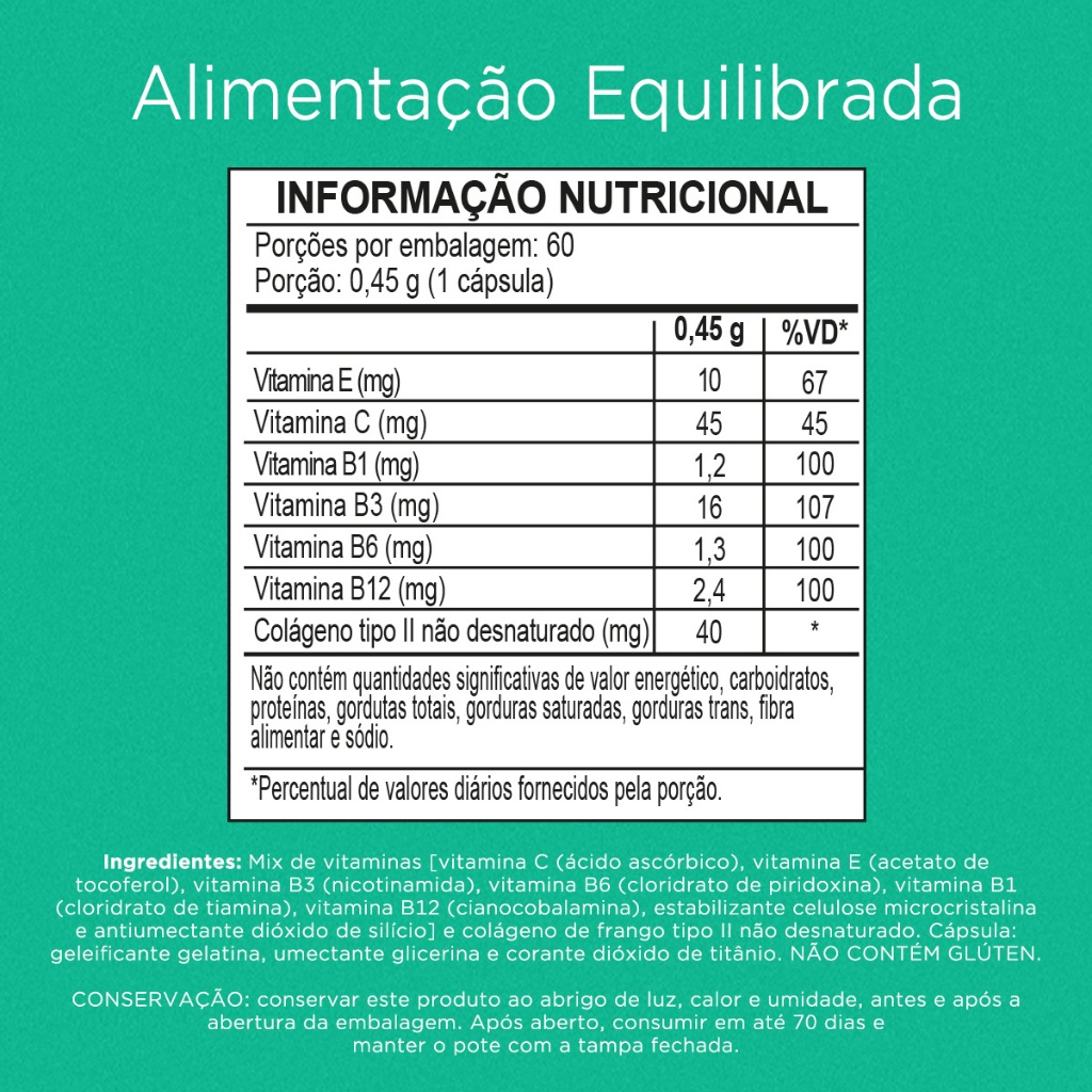 Mantenha Suas Articulações Saudáveis O Collagen II Nutrify é um suplemento que cuida das suas articulações de forma integral. Com peptídeos de colágeno tipo II, ele auxilia na manutenção da flexibilidade e mobilidade, proporcionando suporte essencial para quem busca combinar ciência e bem-estar no dia a dia. Além disso, é enriquecido com um complexo vitamínico que inclui Vitaminas B1, B3, B6, C e E. Cuidado Especial para Cartilagens O colágeno tipo II é fundamental para preservar a integridade da cartilagem e proteger as articulações. O Collagen II Nutrify foi desenvolvido para oferecer um cuidado direcionado e eficiente ao corpo. Ao proporcionar suporte às articulações, ele ajuda na manutenção de uma rotina ativa e equilibrada — ideal para quem busca se movimentar com conforto e qualidade em sua vida diária. Nutrify: Sua Saúde em Harmonia Na Nutrify, entendemos que saúde vai além da nutrição; ela envolve respeito ao meio ambiente também. Nossos suplementos são feitos com matéria-prima vegetal e seguem um padrão clean label. Pensados para atender suas necessidades de forma prática e sustentável, promovemos bem-estar em cada detalhe da sua rotina diária.