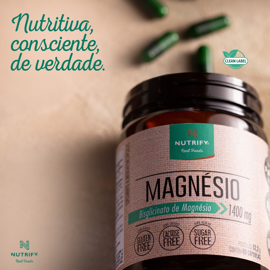 Saúde e Absorção Otimizada O Magnésio Nutrify oferece 1400 mg de bisglicinato de magnésio, uma forma altamente absorvível que potencializa os benefícios do mineral. Ele suporta o sistema neuromuscular, fortalece ossos e dentes, além de manter o equilíbrio eletrolítico — essencial para um corpo saudável. Fórmula Vegana e Clean Label Produzido com matéria-prima vegetal e cápsulas sem glúten ou lactose, é ideal para vegetarianos, veganos e pessoas com intolerâncias alimentares. Recomenda-se consumir 2 cápsulas por dia para complementar sua dieta equilibrada. Além disso, ajuda no metabolismo energético, promove o funcionamento muscular e neuromuscular, contribuindo para a saúde cardiovascular — um aliado essencial para um bem-estar completo. Nutrify: Sua Saúde em Harmonia Na Nutrify, entendemos que saúde vai além da nutrição; ela envolve respeito ao meio ambiente também. Nossos suplementos são feitos com matéria-prima vegetal e seguem um padrão clean label. Pensados para atender suas necessidades de forma prática e sustentável, promovemos bem-estar em cada detalhe da sua rotina diária.