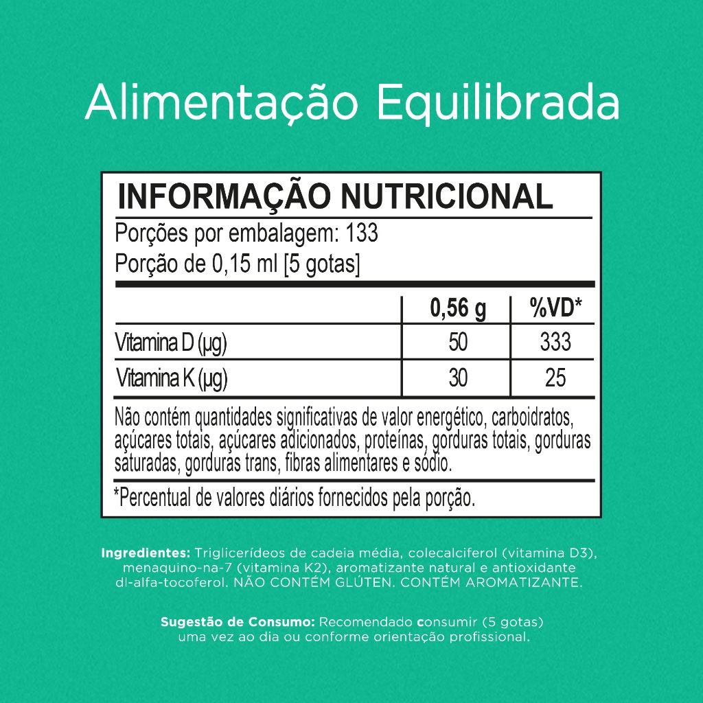 A Vitamina D3K2 Gotas da Nutrify combina as formas mais biodisponíveis de vitamina D3 e K2, garantindo máxima absorção e eficácia. Essa sinergia contribui para a saúde óssea e muscular, auxiliando na formação e manutenção de ossos e dentes, além de promover o equilíbrio corporal. Sua apresentação em gotas oferece praticidade e dosagem flexível, permitindo ajustes conforme necessidades individuais. Produzida pela Nutrify, esse suplemento reflete o compromisso da marca em oferecer produtos nutritivos e de alta qualidade para um estilo de vida saudável.