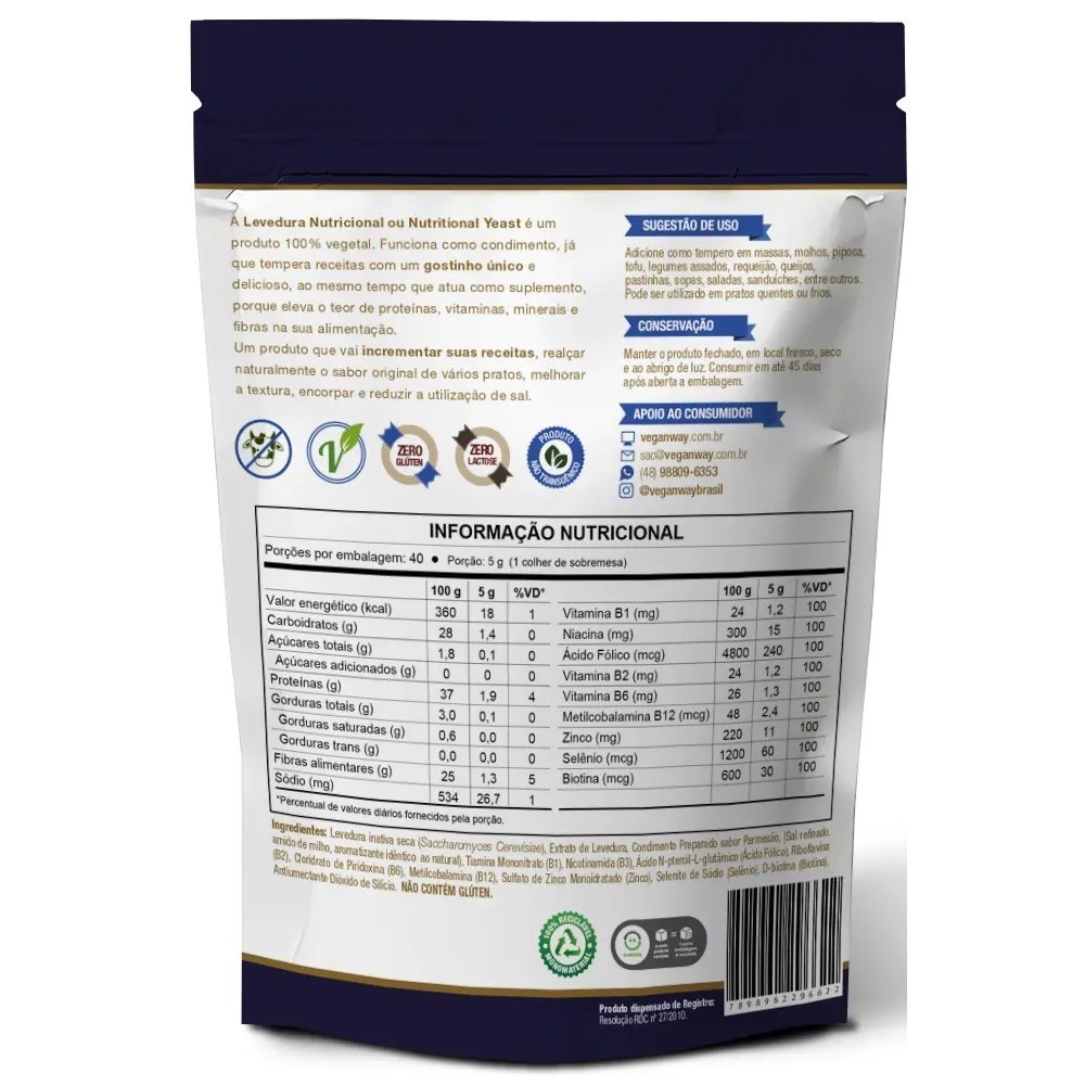 Descrição: Em 2014 a VeganWay inovou no mercado nacional ao lançar a primeira levedura nutricional inativa seca do tipo Saccharomyces cerevisiae feita no Brasil. Obtida no processo de biofermentação da cana-de-açúcar, Nutritional Yeast da VeganWay conquistou o coração dos brasileiros como uma opção acessível de condimento para adicionar sabor e saúde ao preparo de receitas culinárias. Considerado um superalimento, Nutritional Yeast enriquece qualquer receita de prato quente ou frio, sendo um grande aliado da boa forma e do bem-estar para quem busca uma alimentação mais gostosa, natural e funcional. Experimente. Características: - Biodisponível; - Super Alimento; - Sem corantes artificiais; - Sem adição de açúcares; - Fonte natural de fibra alimentar; - Baixo sódio / Sem adição de sal; - Termoestável (pode ser aquecido); - Alto teor de Biotina, a vitamina da beleza; - 100% vd de todas vitaminas do complexo B. Benefícios: - Seguro para celíacos; - Sua dose diária de B12; - Pode ser consumido por alérgicos; - Suplementação natural e saudável; - Sabor especial a pratos quentes e frios; - Promove uma alimentação nutritiva e funcional; - Alavanca o teor nutricional de receitas culinárias; - Rico em antioxidantes que combatem os radicais livres. Ingredientes: Levedura inativa seca (Saccharomyces Cerevisiae), extrato de levedura, condimento preparado sabor parmesão (sal refinado, amido de milho, aroma idêntico ao natural), tiamina mononitrato (B1), nicotinamida (B3), ácido N-pteroil-L-glutâmico (ácido fólico), riboflavina (B2), cloridrato de piridoxina (B6), metilcobalamina (B12). sulfato de zinco monoidratado (zinco), selenito de sódio (selênio), d-biotina (biotina), antiumectante dióxido de silício. NÃO CONTÉM GLÚTEN. Sugestão de uso: Pode ser usado no preparo de receitas, assim como pode ser aplicada como tempero sobre saladas, torradas, pipoca, panquecas, molhos, sopas e massas, entre outros pratos quentes e frios. Conservação: Manter o produto fechado, em local fresco, seco e ao abrigo de luz. Consumir em até 45 dias após aberta a embalagem.
