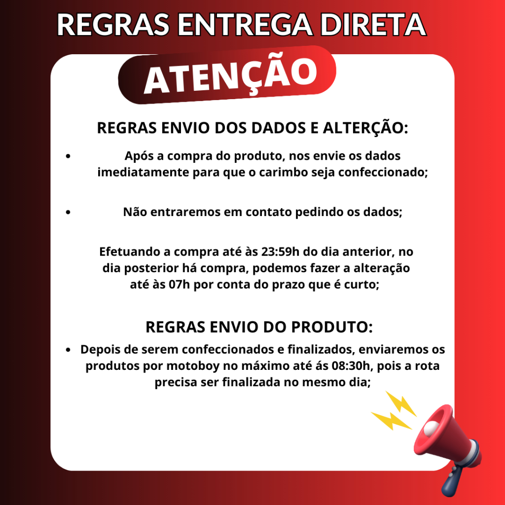 DG Carimbos com variedades em cores, com qualidade e o menor preço Recomendado até 3 linhas Are de impressão 40x60mm Tinta de Cor Preta. ENVIO IMEDIATO -INSTRUÇÕES DE COMPRA: 1º - Após a compra, entre em contato conosco pelo chat e nos envie os dados imediatamente e as cores que deseja o seus carimbos. 2º - Retornaremos via chat para aprovação da arte. 3º - Após a aprovação 1 dia útil para ficar pronto ATEÇÃO!!! CASO DO NÃO ENVIO DOS DADOS EM ATÉ 2 DIAS APÓS A COMPRA SERA ENVIADO SEM OS DADOS. SOMENTE O APARELHO -PRAZO PARA ENVIO: até 1 dias úteis após a confirmação da arte. - Não fixa em tecido e/ou plástico.