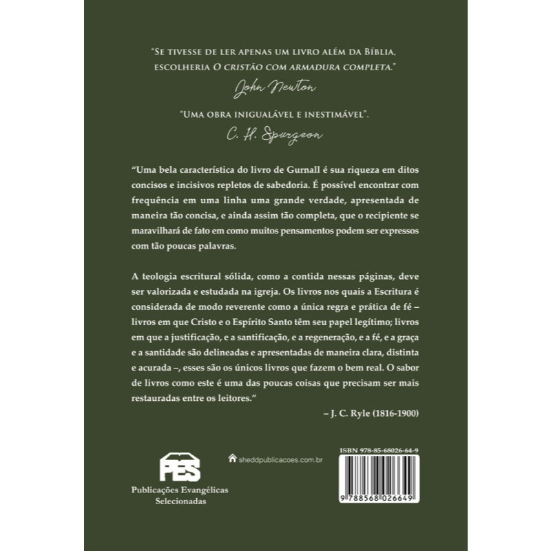 Descrição O Cristão com Armadura Completa é um clássico da literatura cristã que explora a metáfora da armadura espiritual, baseada em Efésios 6. William Gurnall apresenta ensinamentos profundos sobre a batalha espiritual diária, fortalecendo a fé, a perseverança e a vigilância necessárias para o cristão viver vitoriosamente. Esta obra é essencial para quem deseja aprofundar o discipulado e entender a espiritualidade prática à luz da Bíblia. Ficha técnica Autor: William Gurnall Formato: Brochura Páginas: 352 Dimensões: 14 x 21 cm Idioma: Português ISBN: 9788578600549 Palavras-chave O Cristão com Armadura Completa, William Gurnall, Discipulado Cristão, Vida Cristã, Armadura Espiritual, Batalhas Espirituais, Literatura Cristã Clássica