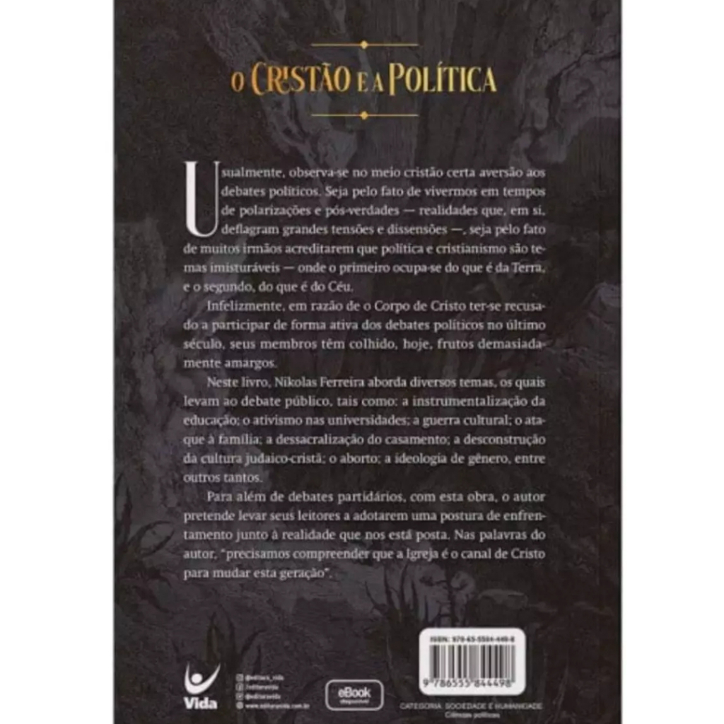 Usualmente, observa-se no meio cristão certa aversão aos debates políticos. Seja pelo fato de vivermos em tempos de polarizações e pós-verdades, seja pelo fato de muitos irmãos acreditarem que política e cristianismo são temas imisturáveis onde o primeiro ocupa-se do que é da Terra, e o segundo, do que é do Céu. Infelizmente, em razão de o Corpo de Cristo ter-se recusado a participar de forma ativa dos debates políticos no último século, seus membros têm colhido, hoje, frutos demasiadamente amargos. Neste livro, Nikolas Ferreira aborda diversos temas, os quais levam ao debate público, tais como: a instrumentalização da educação; o ativismo nas universidades; a guerra cultural; o ataque à família; a dessacralização do casamento; a desconstrução da cultura judaico-cristã; o aborto; a ideologia de gênero, entre outros tantos. Para além de debates partidários, com esta obra, o autor pretende levar seus leitores a adotarem uma postura de enfrentamento da realidade que nos está posta. Nas palavras do autor, “precisamos compreender que a Igreja é o canal de Cristo para mudar esta geração”. 16x23cm 160 Páginas