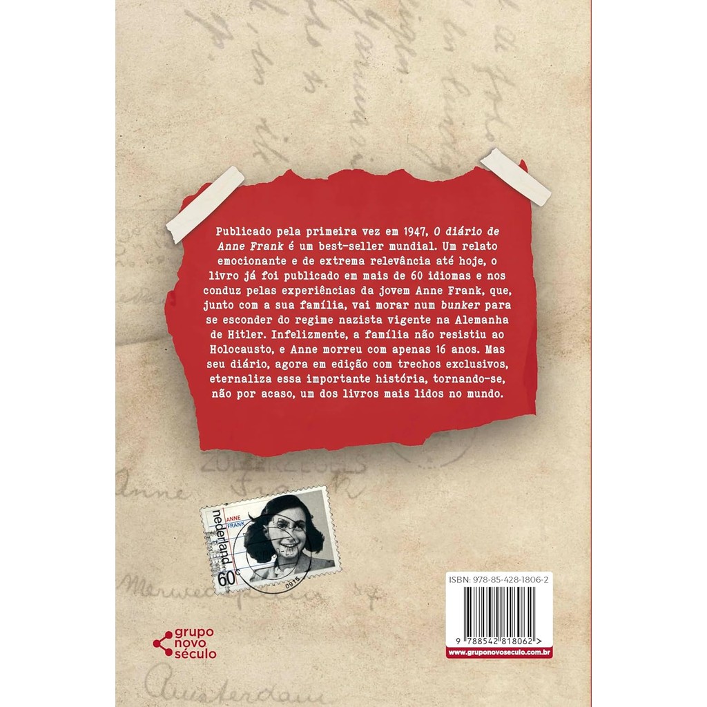 Publicado pela primeira vez em 1947, “O diário de Anne Frank” é um best-seller mundial. Um relato emocionante e de extrema relevância até hoje, o livro já foi publicado em mais de 60 idiomas e nos conduz pelas experiências da jovem Anne Frank, que, junto com a sua família, vai morar num bunker para se esconder do regime nazista vigente na Alemanha de Hitler. Infelizmente, a família não resistiu ao Holocausto, e Anne morreu com apenas 16 anos. Mas seu diário, agora em edição com trechos exclusivos, eterniza essa importante história, tornando-se, não por acaso, um dos livros mais lidos no mundo. Edição integral e com fotos Mais de 35 milhões de exemplares vendidos no mundo todo Traz “Introdução” e “O que aconteceu depois”, contextualizando a leitura para todos os leitores Contém marca paginas em conjunto do livro Sobre o Autor Anne Frank, nascida Annelies Marie Frank em 12 de junho de 1929 em Frankfurt, Alemanha, foi uma jovem judia cuja vida se tornou emblemática das atrocidades do Holocausto. Anne começou a escrever o diário após recebê-lo de seu pai aos 13 anos, mais especificamente em 1942 quando se escondeu com a sua família em um anexo secreto no escritório onde seu pai trabalhava em Amsterdã para escapar da perseguição nazista. Anne conta em seu diário sua rotina escondida dentro do anexo, dos 13 aos 16 anos, até Anne e sua família forem descobertos em 1944 e enviados para campos de concentração, onde Anne morreu de tifo em Bergen-Belsen em março de 1945, pouco antes da libertação do campo. Especificações: Editora: Novo Século Data da publicação: 20 de junho de 2025 Edição: 1ª Idioma: Português Número de páginas: 208 páginas ISBN: 978-8542818062 Peso do produto: 200 g Idade de leitura: 15 anos e acima Dimensões: 16 x 1 x 23 cm ******************************************************************************************************************* A Amoler é mais do que uma editora e livraria; somos apaixonados por histórias que inspiram, emocionam e transformam. Cada livro é escolhido com carinho, porque acreditamos que uma boa leitura pode ser um refúgio, uma aventura ou até um novo começo. Na nossa loja online, você encontra sempre livros originais e novos, perfeitos para quem busca qualidade e histórias que marcam. Dos clássicos aos lançamentos mais desejados, temos algo especial esperando por você. E sabe por quê? Porque quem ama ler, ama descobrir, sonhar e aprender. E quem ama tudo isso, ama a Amoler.