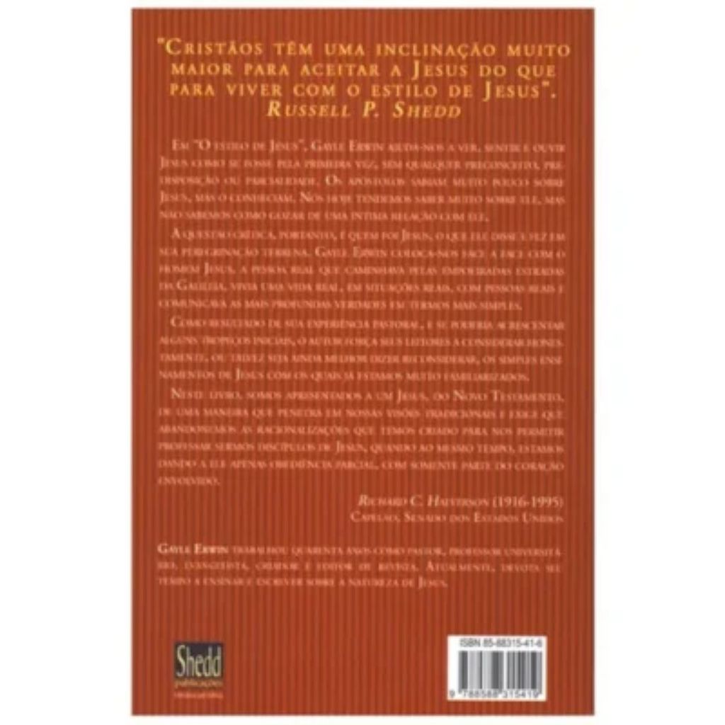 O Estilo de Jesus | Lições práticas de sua vida e ministério | Gayle D. Erwin Gayle Erwin, neste livro, nos apresenta a um Jesus de maneira que penetra em nossas visões tradicionais e exige que abandonemos as racionalizações que temos criado para nos permitir professar sermos de Jesus, quando ao mesmo tempo, estamos dando a Ele apenas obediência parcial, com somente parte do nosso coração envolvido. Detalhes: Título: O Estilo de JesusSubtítulo: Lições práticas de sua vida e ministério Autor: Gayle D. Erwin Páginas: 192 Dimensões: 14 x 21 cm Acabamento: brochura Editora: Shedd