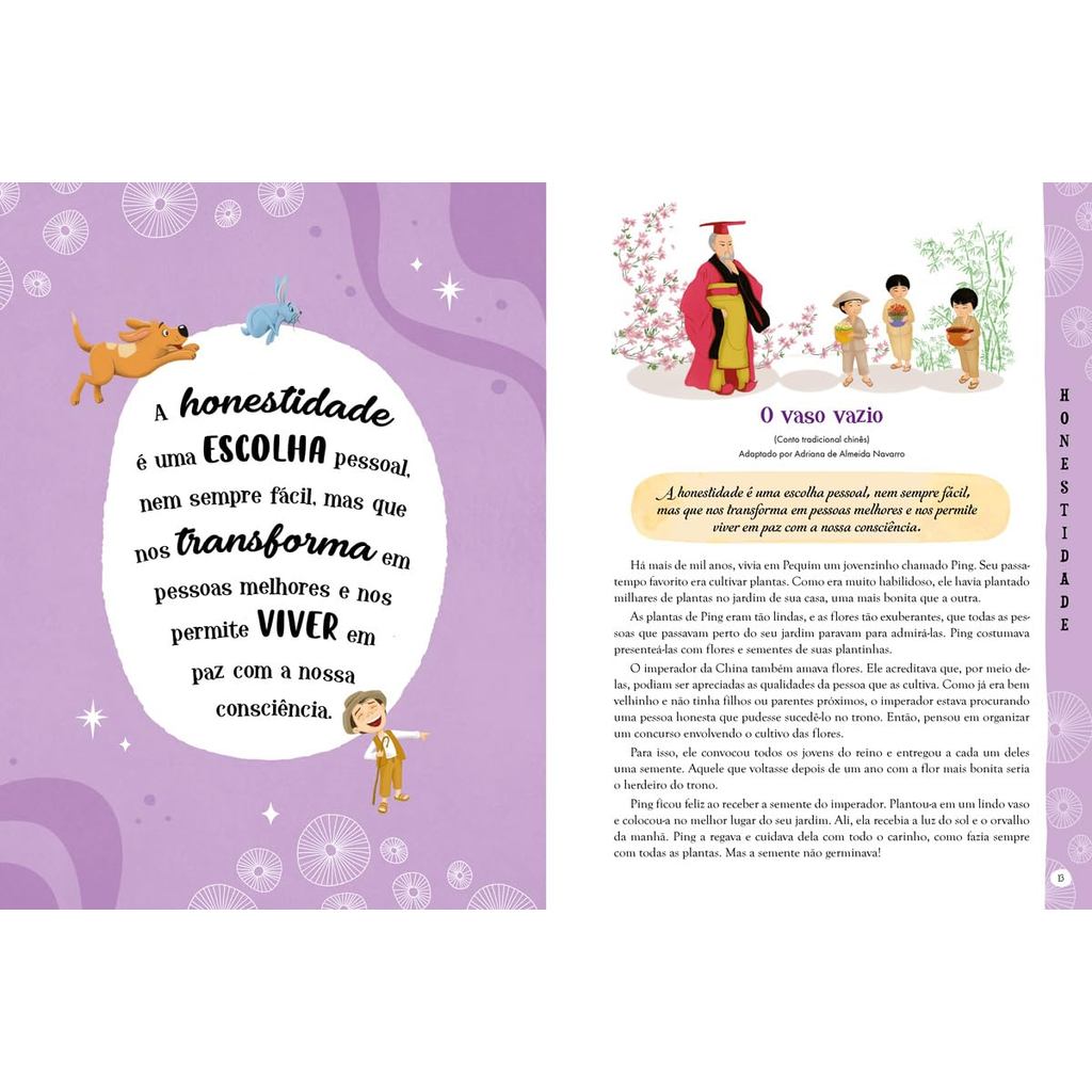 Virtudes, como coragem, justiça, amizade e generosidade, são qualidades honráveis, que ajudam a fortalecer o nosso caráter e a nutrir a nossa essência. Cultivar as virtudes, dia após dia, é fundamental para nossa evolução e para promover o bem ao nosso redor. Com este livro, você poderá conhecer e descobrir a importância de diversas virtudes por meio de contos, fábulas, lendas e muito mais. Página a página, você será levado a refletir sobre seus hábitos, ou virtudes, e o quanto eles podem fazer a diferença na sua vida e das pessoas à sua volta. 27X21 CM 144 Páginas