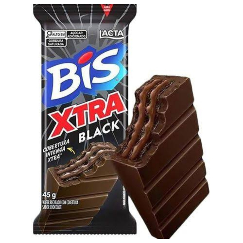 O Bis já é bom, mas com chocolate extra é a combinação perfeita do famoso wafer crocante de Bis, com o delicioso chocolate ao leite Lacta . Uma explosão de sabores em uma embalagem de 45g, perfeita para ter na mochila, na gaveta do escritório ou na despensa de casa, para quando bater aquele descontrole por doce! Ingredientes: Açúcar, gordura vegetal, soro de leite em pó, farinha de trigo enriquecida com ferro, ácido fólico, vitaminas B1, B2, B3 e zinco, leite em pó integral, gordura vegetal hidrogenada, biscoito (contém trigo), cacau, extrato de malte, sal, óleo vegetal, gordura de manteiga desidratada, emulsificantes: lecitina de soja e poliglicerol polirricinoleato, fermento químico bicarbonato de sódio e aromatizante. Vide tabela nutricional abaixo. * %Valores Diários com base em uma dieta de 2.000kcal ou 8.400kj. Seus valores diários podem ser maiores ou menores dependendo de suas necessidades energéticas. ** VD não estabelecido. *** Porção de referência de 30g.