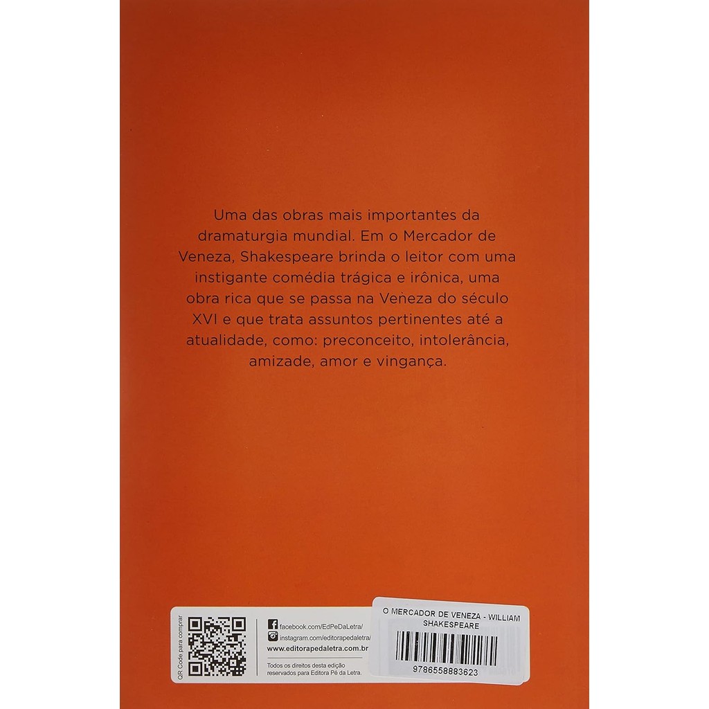 Shakespeare inspirou-se em duas fontes para desenvolver esse clássico sem fronteiras espaciais e temporais: Il Pecorone e Gesta Romanorum - a primeira é uma coletânea de novelle italianas escritas por Giovanni Fiorentino e a segunda, de autoria aindadesconhecida, nasceu no século XIII, mas teve duas edições em inglês no século XVI. o mercador de Veneza é uma das obras mais populares e debatidas desse grande nome da literatura universal - trata-se de um drama trágico, com pitadas de romantismo ecomédia. Questões mais profundas se entrelaçam e sustentam a emoção do enredo, tais relações como o ódio, o orgulho, o dinheiro, o amor, a amizade, a ingenuidade e a maledicência. Sem dúvida, é uma das obras mais importantes da dramaturgia literáriamundial; escrita em 1594, a narrativa ganhou adaptações em filmes e peças em todo o mundo. A trama que envolve o vilão Shylock e o mocinho Antonio encanta leitores e plateias a mais de quatro séculos, nos transportando para uma Veneza histórica e fascinante. 14x21cm 140 Páginas