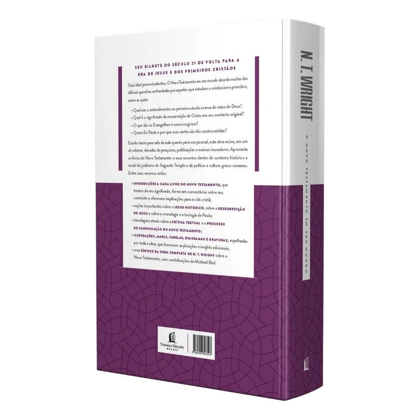 O Novo Testamento Em Seu Mundo | N. T. Wright e Michael F. Bird N. T. WrightO Novo Testamento em seu Mundo é um guia indispensável para estudantes de cristianismo primitivo, abordando questões cruciais como o entendimento do reino de Deus no primeiro século e o significado original da ressurreição de Cristo. Este volume único oferece uma análise dos Evangelhos, explora a figura de Paulo e suas cartas controversas, tudo dentro do contexto histórico e social do judaísmo do Segundo Templo e da cultura greco-romana. Ideal para uso acadêmico e pessoal, inclui introduções detalhadas a cada livro do Novo Testamento, discussões sobre o Jesus histórico e a ressurreição, além de insights atualizados sobre crítica textual e o processo de canonização do Novo Testamento, complementados por ilustrações, mapas e uma síntese da obra de N. T. Wright sobre o tema, com contribuições de Michael Bird. Altura: 23,5 cm Largura: 16 cm Profundidade: 6 cm Páginas: 976 Peso: 1580 g