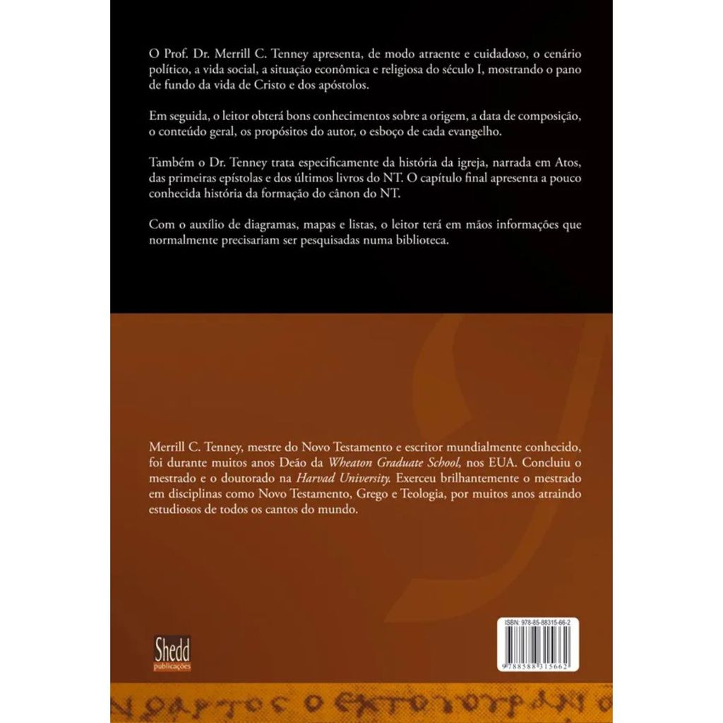 O Prof. Dr. Merrill C. Tenney apresenta, de modo atraente e cuidadoso, o cenário político, a vida social, a situação econômica e religiosa do século I, mostrando o pano de fundo da vida de Cristo e dos apóstolos. Em seguida, o leitor obterá bons conhecimentos sobre a origem, a data de composição, o conteúdo geral, os propósitos do autor, o esboço de cada evangelho. Também o Dr. Tenney trata especificamente da história da igreja, narrada em Atos, das primeiras epístolas e dos últimos livros do NT. O capítulo final apresenta a pouco conhecida história da formação do cânon do NT. Com o auxílio de diagramas, mapas e listas, o leitor terá em mãos informações que normalmente precisariam ser pesquisadas numa biblioteca. Obs. Publicado anteriormente por Edições Vida Nova. Detalhes do produto: Autor: Merrill C. Tenney Editora: Shedd Publicações Acabamento: Capa comum brochura Formato: 16x23cm Número de páginas: 440