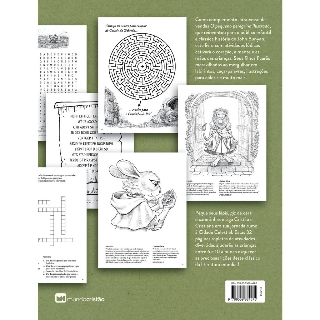 O Pequeno Peregrino Ilustrado | Livro de Colorir com Atividades Como complemento ao sucesso de vendas O pequeno peregrino ilustrado, que reinventou para o público infantil a célebre história escrita por John Bunyan, este livro cativará o coração, a mente e as mãos das crianças. Seus filhos ficarão maravilhados ao mergulhar em labirintos, caça - palavras, ilustrações para colorir e muito mais. Pegue seus lápis, giz de cera e canetinhas e siga Cristão e Cristiana em sua jornada rumo à Cidade Celestial. Estas 32 páginas repletas de atividades lúdicas ajudarão as crianças entre 6 e 10 a nunca se esquecerem das preciosas lições deste clássico da literatura mundial! Título: O Pequeno Peregrino Ilustrado Páginas: 32 Dimensões: 21 x 27 cm Capa: Brochura Editora: Mundo Cristão
