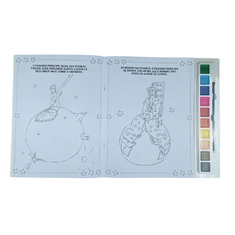 Explore o asteroide B612 com Pequeno Príncipe em lindas páginas para colorir! Com uma aquarela com 10 cores e um pincel, divirta-se dando vida a essa história encantadora!