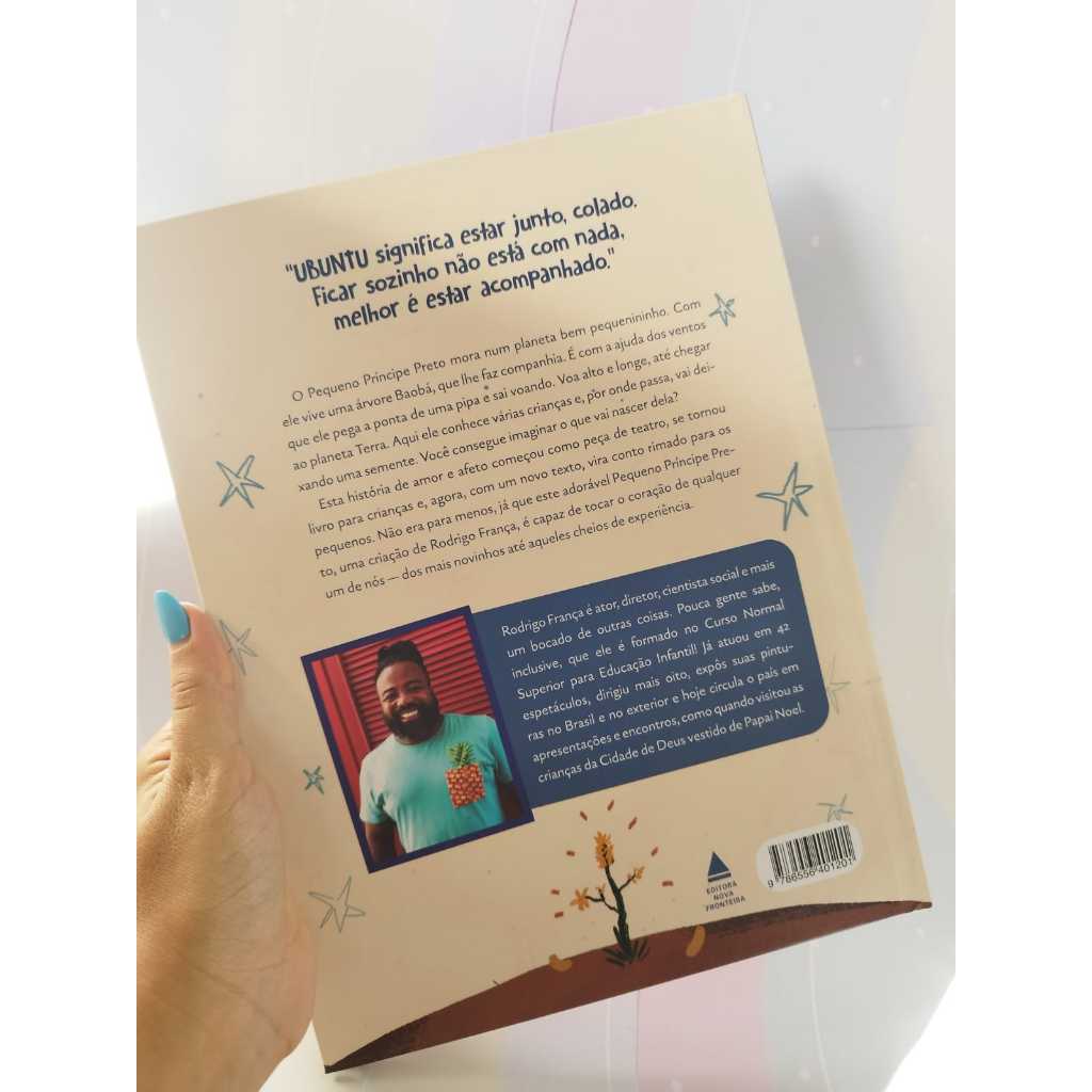Em um minúsculo planeta, vive o Pequeno Príncipe Preto. Além dele, existe apenas uma árvore Baobá, sua única companheira. Quando chegam as ventanias, o menino viaja por diferentes planetas, espalhando o amor e a empatia. Originalmente uma peça de teatro, a história criada por Rodrigo França virou livro infantil e ganha, nesta edição, uma versão para os pequeninos. Com linguagem adequada à Educação Infantil e cheia de rimas, essa delicada história agora alcança também meninos e meninas pré-leitores e em processo de alfabetização, mostrando que desde cedo podemos descobrir a importância de nossos laços de carinho e afeto. Afinal, como diz o Pequeno Príncipe Preto, juntos somos mais fortes, coração com coração. Para as crianças maiores, indicamos "O Pequeno Príncipe Preto", também escrito por Rodrigo França e ilustrado por Juliana Barbosa Pereir 27x20cm 32 Páginas