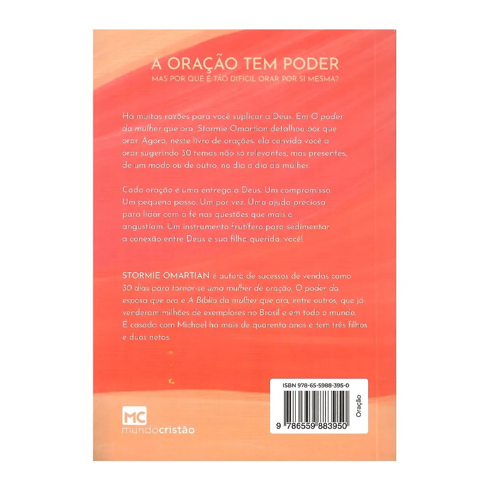 Descrição O livro O Poder da Mulher Que Ora, de Stormie Omartian, é um guia prático que convida as mulheres a fortalecerem sua vida espiritual por meio da oração. Com 31 capítulos, cada um abordando temas relevantes para o cotidiano feminino, a autora oferece histórias inspiradoras, modelos de oração e versículos bíblicos que auxiliam na construção de uma prática de oração consistente e transformadora. Esta edição de bolso é compacta e ideal para levar no dia a dia, permitindo que as leitoras integrem momentos de oração em sua rotina de forma acessível e significativa. Com uma abordagem honesta e próxima, Omartian proporciona uma leitura fácil de aplicar, visando vitórias pessoais e familiares através da oração. Ficha técnica Autor: Stormie Omartian Editora: Mundo Cristão Acabamento: Brochura Páginas: 128 Dimensões: 11 x 0,6 x 15 cm Peso: 0,08 kg Idioma: Português ISBN: 9786559883950 Palavras-chave oração feminina, vida devocional, Stormie Omartian, espiritualidade, fé cristã, livro de orações, crescimento espiritual
