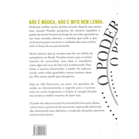 O poder do subconsciente lhe ensinará técnicas para desenvolver todo o potencial da sua mente, superando adversidades, alcançando seus objetivos e mudando situações aparentemente irreversíveis. Não é mágica, não é mito nem lenda.  Depois de entender o poder do seu subconsciente, você também pode se desprender de suas inseguranças e abrir um novo mundo de energia positiva.   O poder do subconsciente ajudou milhões de pessoas a alcançarem grandes objetivos apenas mudando a maneira de pensar. As técnicas revolucionárias descritas pelo Dr. Murphy baseiam-se em um princípio simples e prático: Se você acredita em algo sem restrições e faz um retrato disso em sua mente, remove os obstáculos subconscientes para que seu desejo se concretize. Assim, qualquer um pode transformar em realidade aquilo em que acredita.  Uma excelente maneira de ficar familiarizado com as duas funções da sua mente é considerá-la um jardim. Você é um jardineiro e planta sementes (pensamentos) em seu subconsciente o dia inteiro, baseado nos seus pensamentos habituais. Na medida em que você semeia, terá colheitas em seu corpo e ambiente. Cada pensamento é, portanto, uma causa, e cada condicionamento, um efeito. Por essa razão, é essencial que você tome cuidado com todos os seus pensamentos, a fim de ter apenas situações ou condições desejáveis. Quando sua mente pensa corretamente, quando você compreende a verdade, quando os pensamentos depositados em seu subconsciente são construtivos, harmoniosos e pacíficos, o poder mágico do seu subconsciente responderá com situações harmoniosas, circunstâncias agradáveis, tudo o que há de melhor. Quando você começa a controlar seus processos de pensamento, pode aplicar os poderes do subconsciente a qualquer problema ou dificuldade. Em outras palavras, você estará na verdade. Com a descrição de histórias verídicas de sucesso, O poder do subconsciente é um guia para libertar o poder da mente que revela os segredos para melhorar um casamento, vencer medos, eliminar hábitos nocivos, curar pequenos problemas de saúde e obter promoções, prestígio, dinheiro e felicidade pessoal.