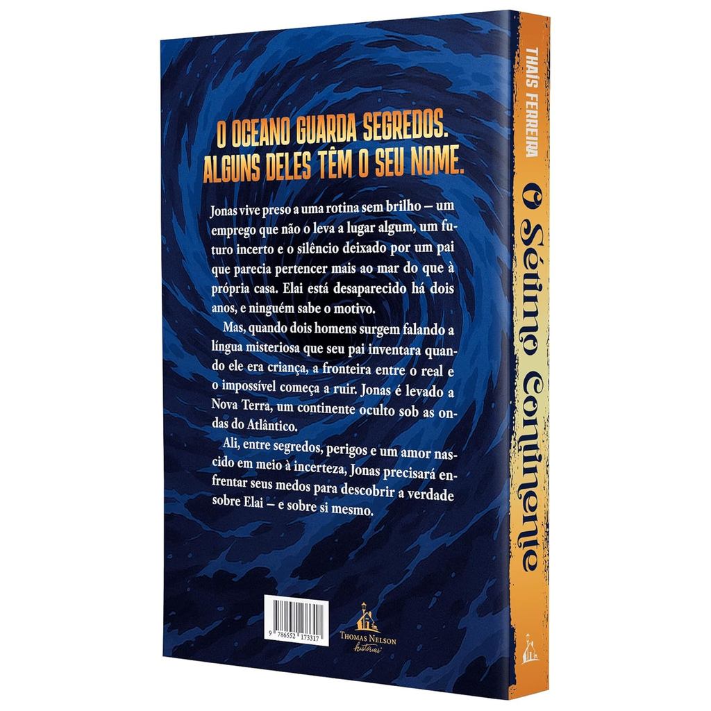 O OCEANO GUARDA SEGREDOS. ALGUNS DELES TÊM O SEU NOME. Jonas vive preso a uma rotina sem brilho ― um emprego que não o leva a lugar algum, um futuro incerto e o silêncio deixado por um pai que parecia pertencer mais ao mar do que à própria casa. Elai está desaparecido há dois anos, e ninguém sabe o motivo. Mas, quando dois homens surgem falando a língua misteriosa que seu pai inventara quando ele era criança, a fronteira entre o real e o impossível começa a ruir. Jonas é levado a Nova Terra, um continente oculto sob as ondas do Atlântico. Ali, entre segredos, perigos e um amor nascido em meio à incerteza, Jonas precisará enfrentar seus medos para descobrir a verdade sobre Elai ― e sobre si mesmo. 21x14 cm 464 Páginas