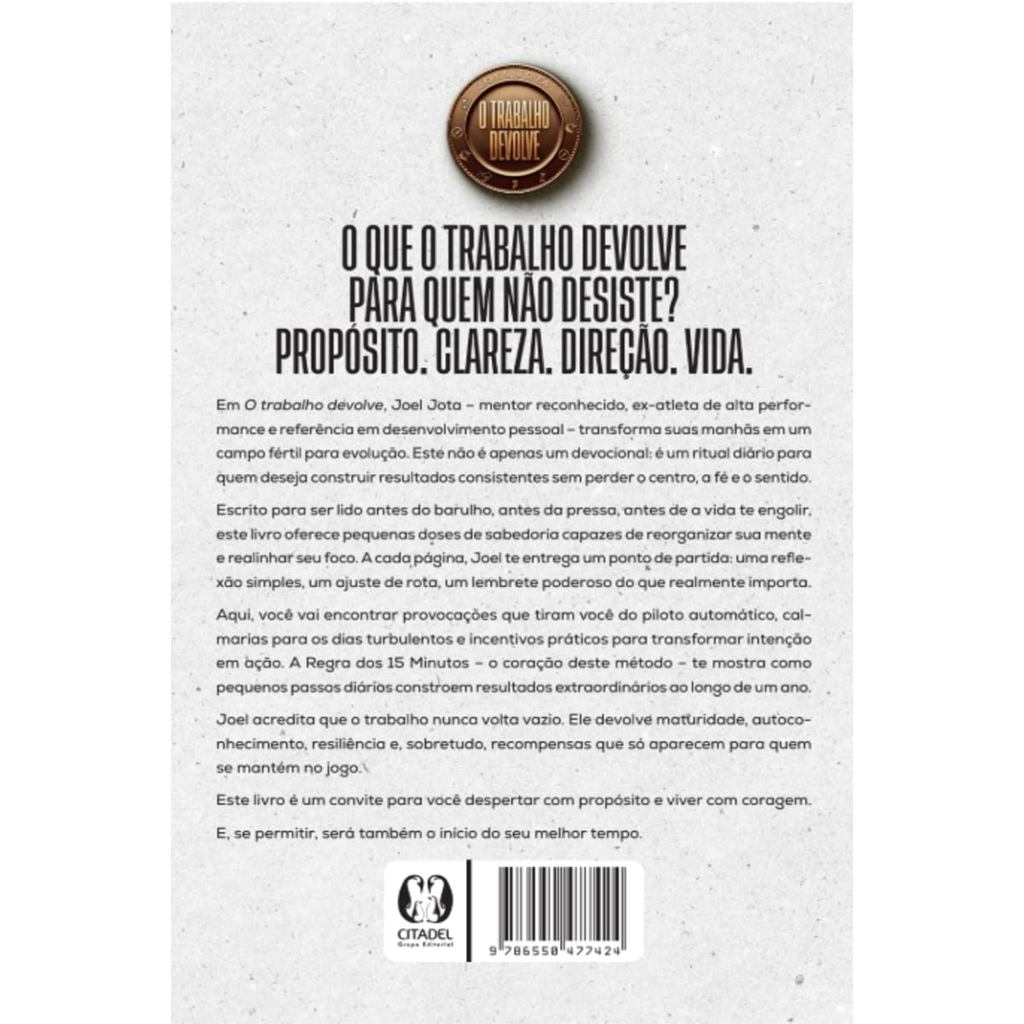O que o trabalho devolve para quem não desiste?Propósito. Clareza. Direção. Vida.Em O trabalho devolve, Joel Jota – mentor reconhecido, ex-atleta de alta performance e referência em desenvolvimento pessoal – transforma suas manhãs em um campo fértil para evolução. Este não é apenas um devocional: é um ritual diário para quem deseja construir resultados consistentes sem perder o centro, a fé e o sentido.Escrito para ser lido antes do barulho, antes da pressa, antes de a vida te engolir, este livro oferece pequenas doses de sabedoria capazes de reorganizar sua mente e realinhar seu foco. A cada página, Joel te entrega um ponto de partida: uma reflexão simples, um ajuste de rota, um lembrete poderoso do que realmente importa. Aqui, você vai encontrar provocações que tiram você do piloto automático, calmarias para os dias turbulentos e incentivos práticos para transformar intenção em ação.A Regra dos 15 Minutos – o coração deste método – te mostra como pequenos passos diários constroem resultados extraordinários ao longo de um ano.Joel acredita que o trabalho nunca volta vazio. Ele devolve maturidade, autoconhecimento, resiliência e, sobretudo, recompensas que só aparecem para quem se mantém no jogo. Este livro é um convite para você despertar com propósito e viver com coragem.E, se permitir, será também o início do seu melhor tempo. 16x23cm 384 Paginas
